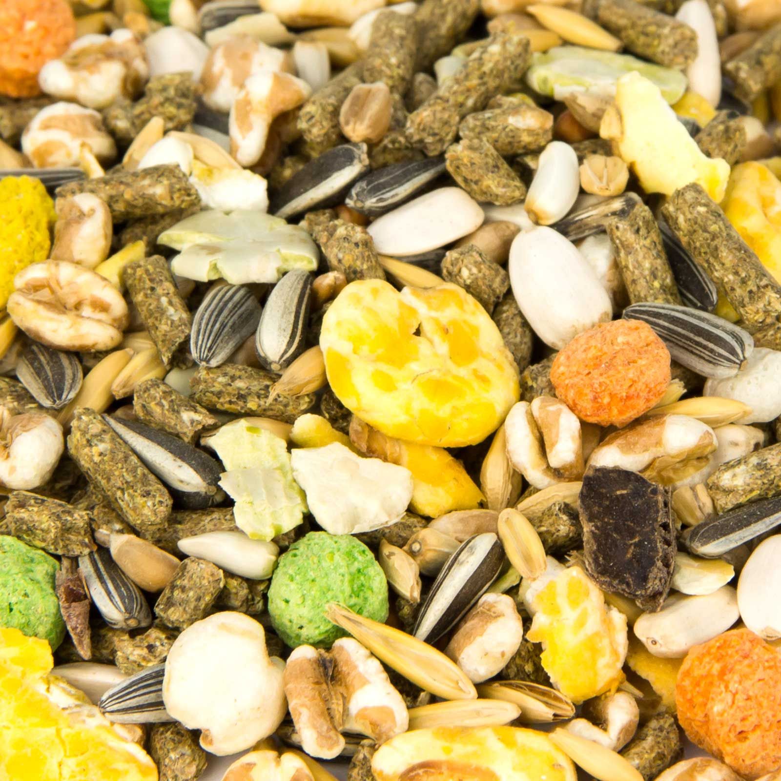Grâu, tărâțe de grâu grosier, făină verde, porumb încolțit, semințe de floarea-soarelui vărgate, ovăz, orz de bere, fulgi de mazăre, semințe de cardi, boabe de milo, grâu încolțit, concentrat de porumb, pulpă uscată, semințe de floarea-soarelui alb, crochete de porumb roșu, Crochete de porumb verzi, Carob tăiat, Făină de extracție de rapiță cu baton, Turtă de semințe de dovleac, Melasă, Crochete de porumb galbene, Lignoceluloză, Carbonat de calciu, Fosfat monocalcic, Clorură de sodiu, Bicarbonat de sodiu, Oxid de magneziu