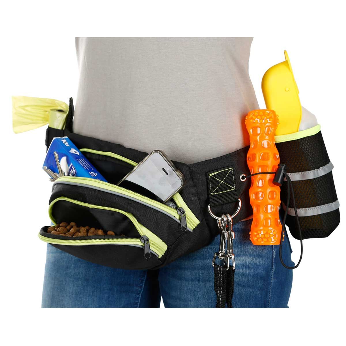 - ausgestattet mit zwei Reißverschlusstaschen, Kotbeuteltasche, D-Ring, elastischer Schlaufe und Trinkflaschentasche