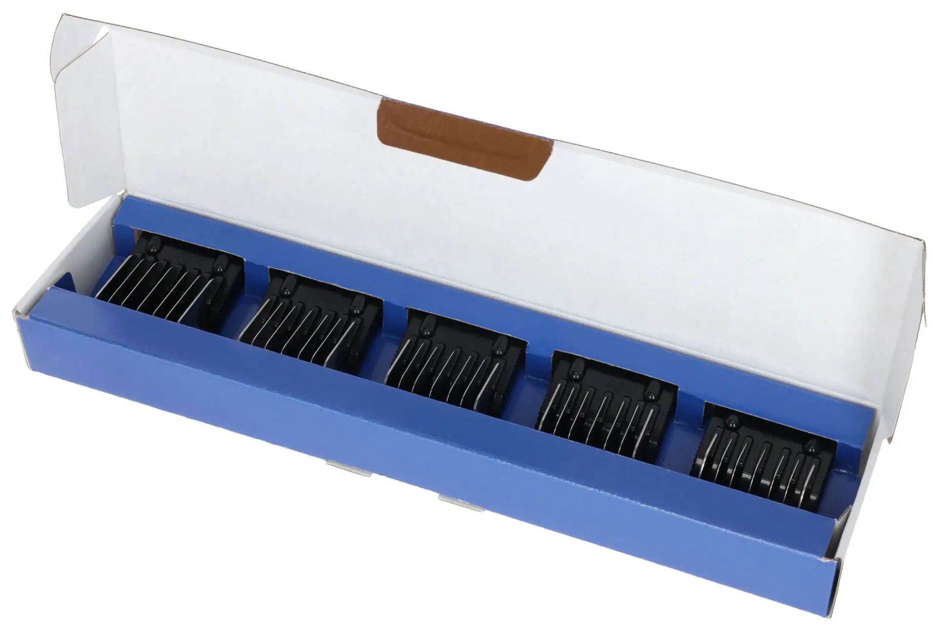 Pieptenele de fixare asigură un model de tundere uniform și optim la diferite lungimi de tăiere și sunt ușor de deplasat. Alunecă ușor prin blană. Capetele de tuns pot fi atașate ușor și rapid. Setul grozav este format din 5 piepteni cu clips (disponibil doar ca set).