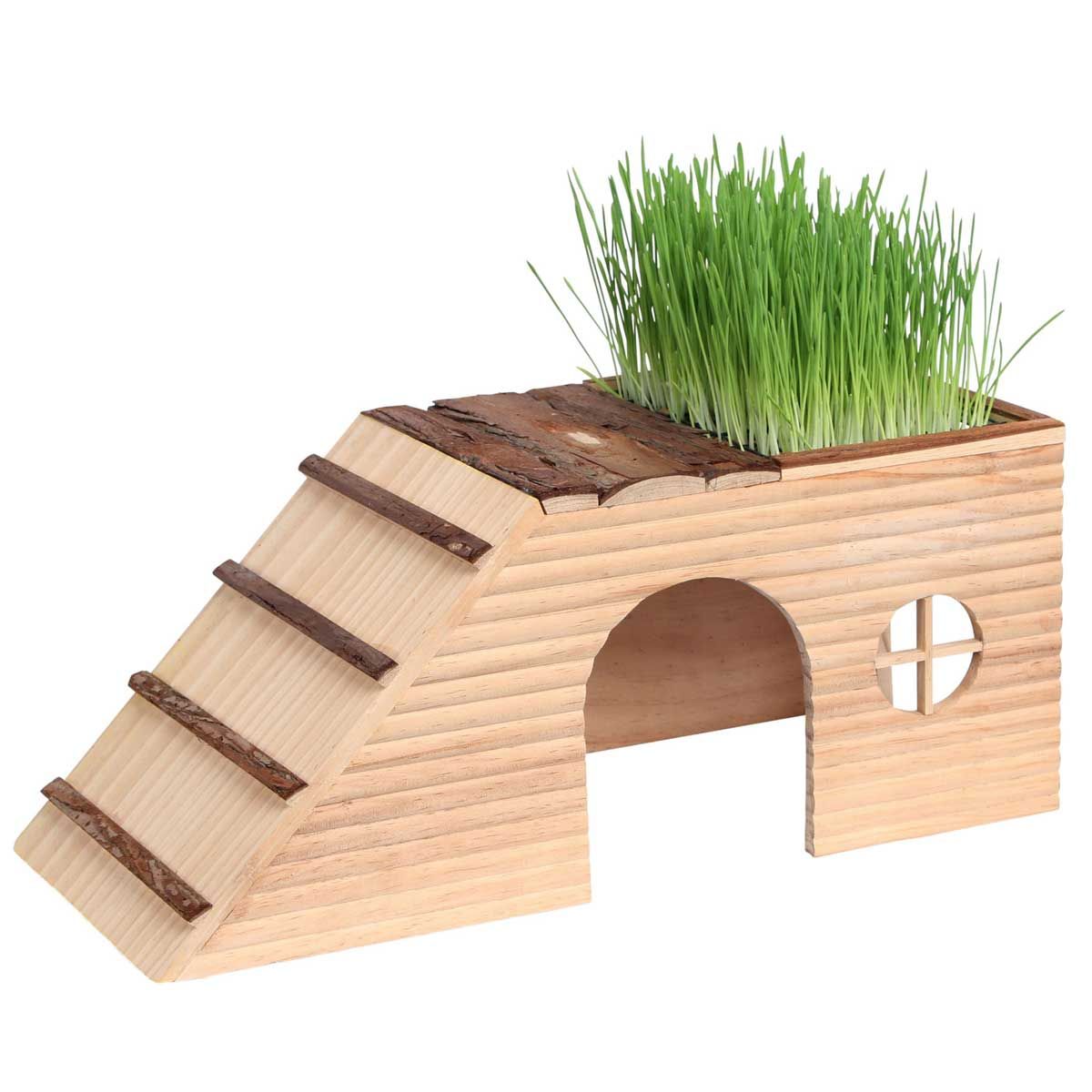Das Nagerhaus besitzt eine Rampe und einen integrierten Futterplatz für Nagergras.