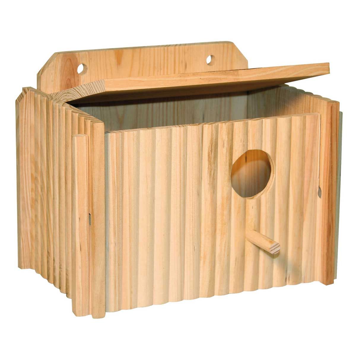 Cutie de cuibărit pentru papagali cu tavă de cuibărit integrată și bară de apropiere. Capacul cu balamale permite curățarea și inspectarea cuibului.