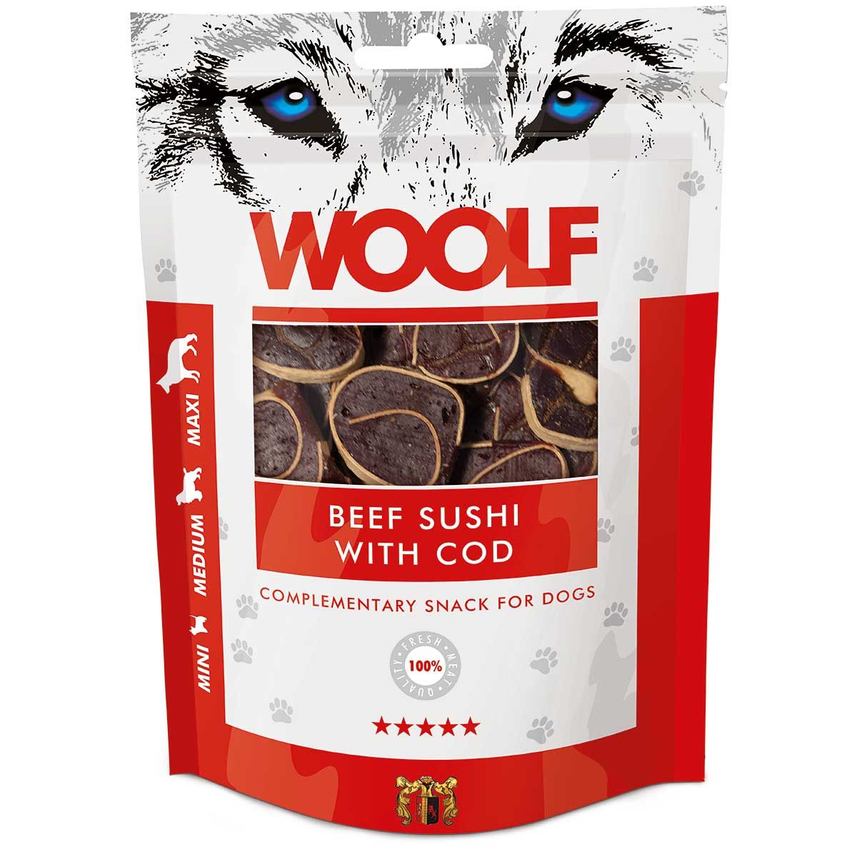 Woolf snack pentru câini cu carte de vită Sushi 100 g
