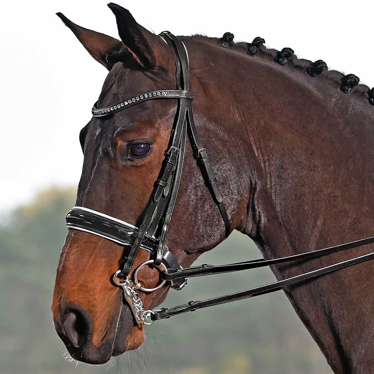 Bridă dublă modernă de înaltă calitate în ceea ce privește potrivirea, efectul și designul. Întotdeauna un aspect strălucitor, fără a fi nevoie de îngrijire suplimentară sau de lustruire, datorită pielii de patent deosebit de rezistente de pe nas.