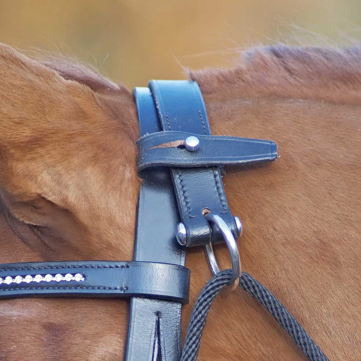 - Compus dintr-o piesă de bază reglabilă în lungime, o căpăstru și un cordon continuu cu carabiniere pentru agățarea în inelele de mușcătură