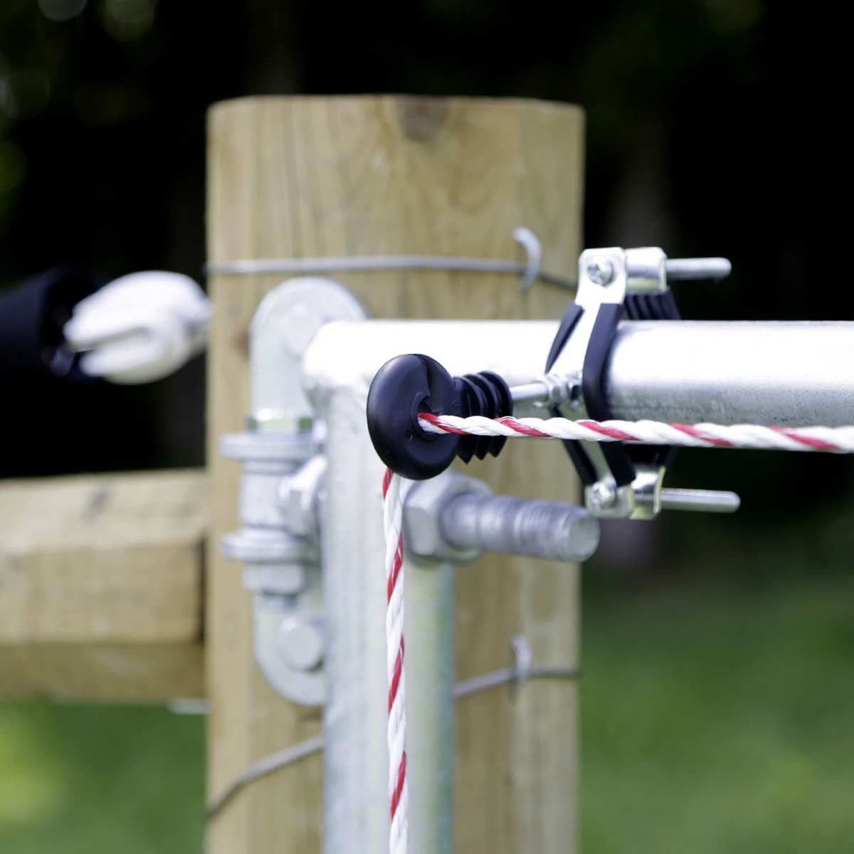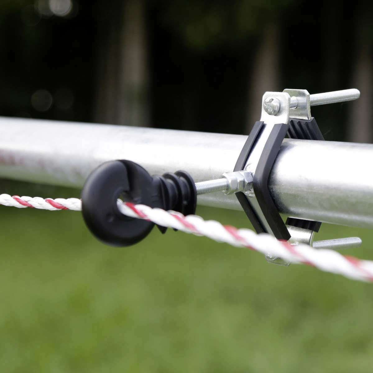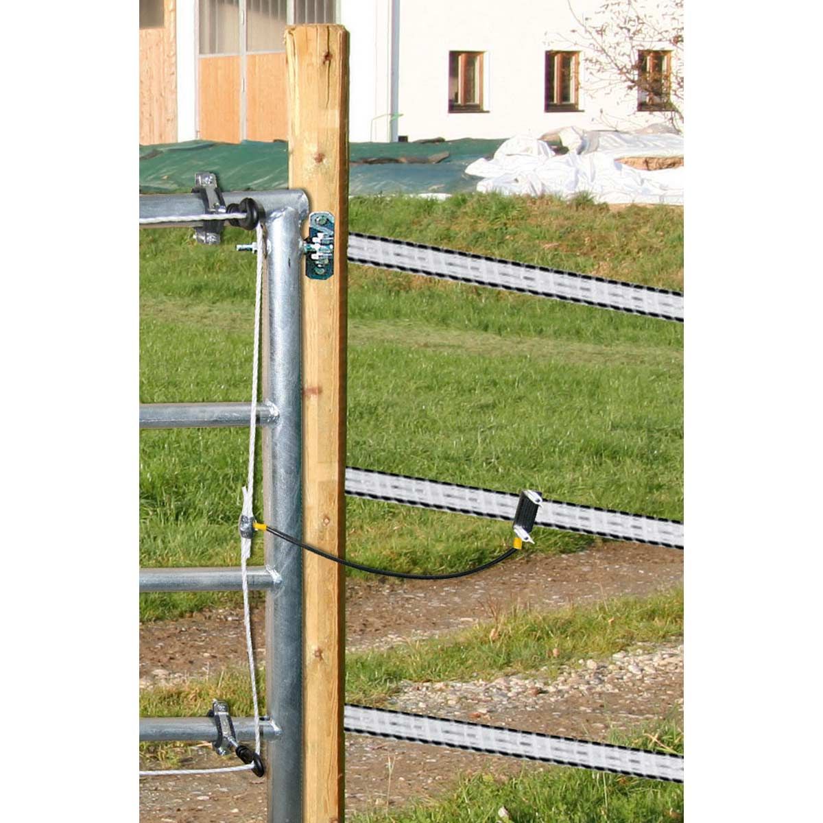 Cu ajutorul setului electric, poarta dvs. de pășune poate fi ușor electrificată și conectată la un gard de pășune existent. Acest lucru asigură o siguranță maximă a turmei.