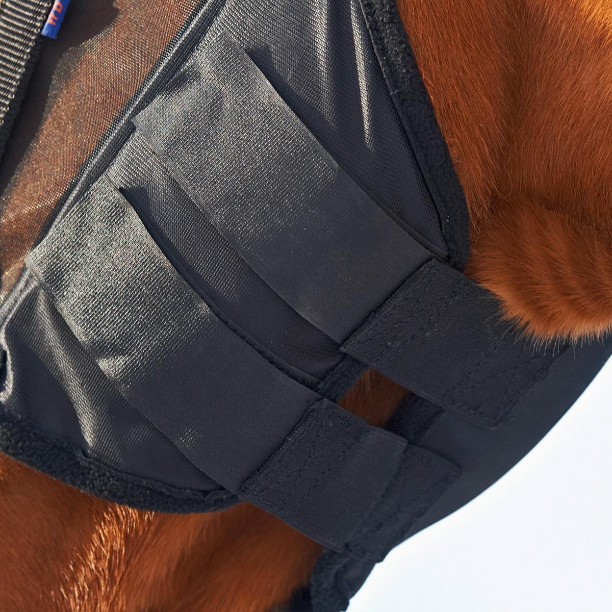 A fly mask has to fit well to be able to help. Otherwise damage may occur. The fit must fit the horse/pony's head. You can make a final adjustment using any setting options on the product. Even with an optimally fitted fly mask, the fit must be checked regularly, conscientiously and professionally and corrected if necessary. If the fly mask slips, vision can be limited or lost. For the horse, a flight animal, this can lead to panic and cause accidents. The ideal seat can be jeopardized by, for example, rubbing in the head area or conspecifics kept in groups. The use of fly masks is not recommended in such individual cases. Check the fur and skin regularly for chafing. Even with optimally fitting fly masks, these can be caused by foreign substances (e.g. stones, insects) between the mask and the horse. The risk of skin irritation increases due to sweat. Clean the mask regularly.