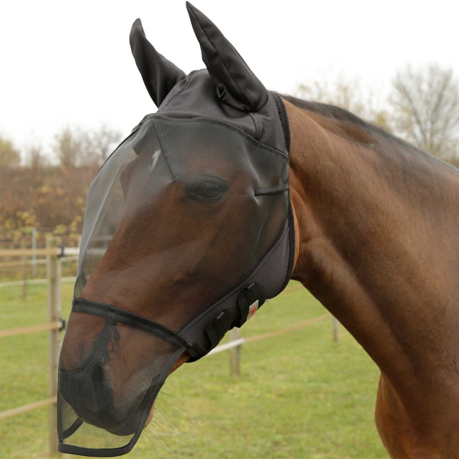 Această mască anti-muscă cu protecție pentru urechi și nări are o barieră anti-mușcă încorporată între nări și zona ochilor și astfel vă protejează în mod optim calul de insectele enervante.
