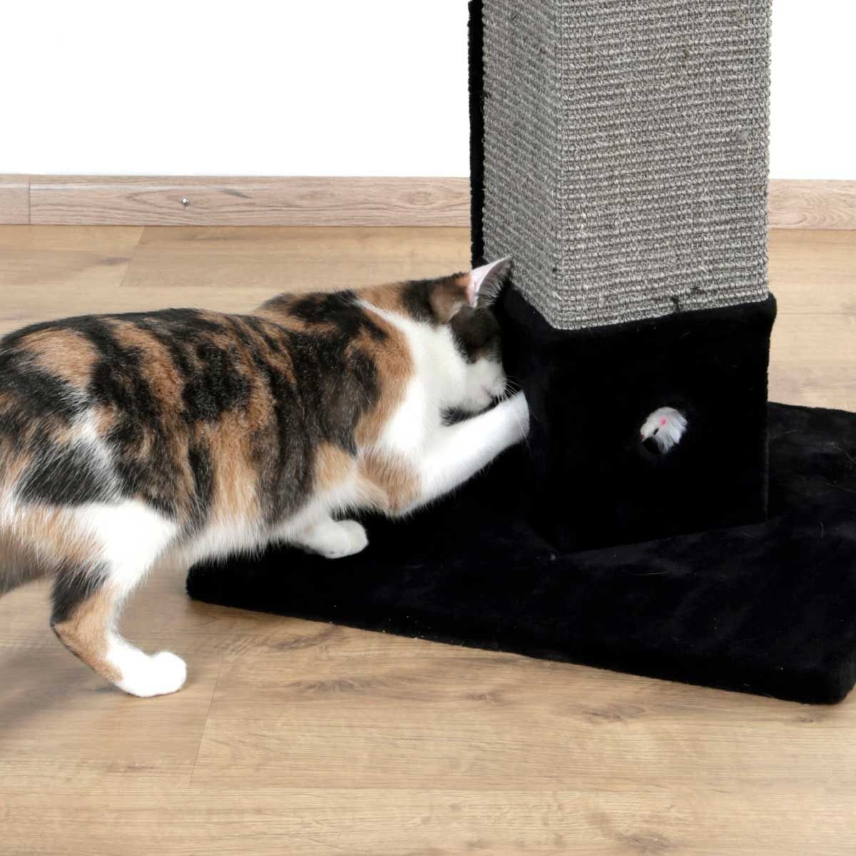 Dieser eckige Kratzstamm ist an drei Seiten mit einem Sisalteppich verklebt und an den restlichen Stellen mit Plüsch bezogen.
