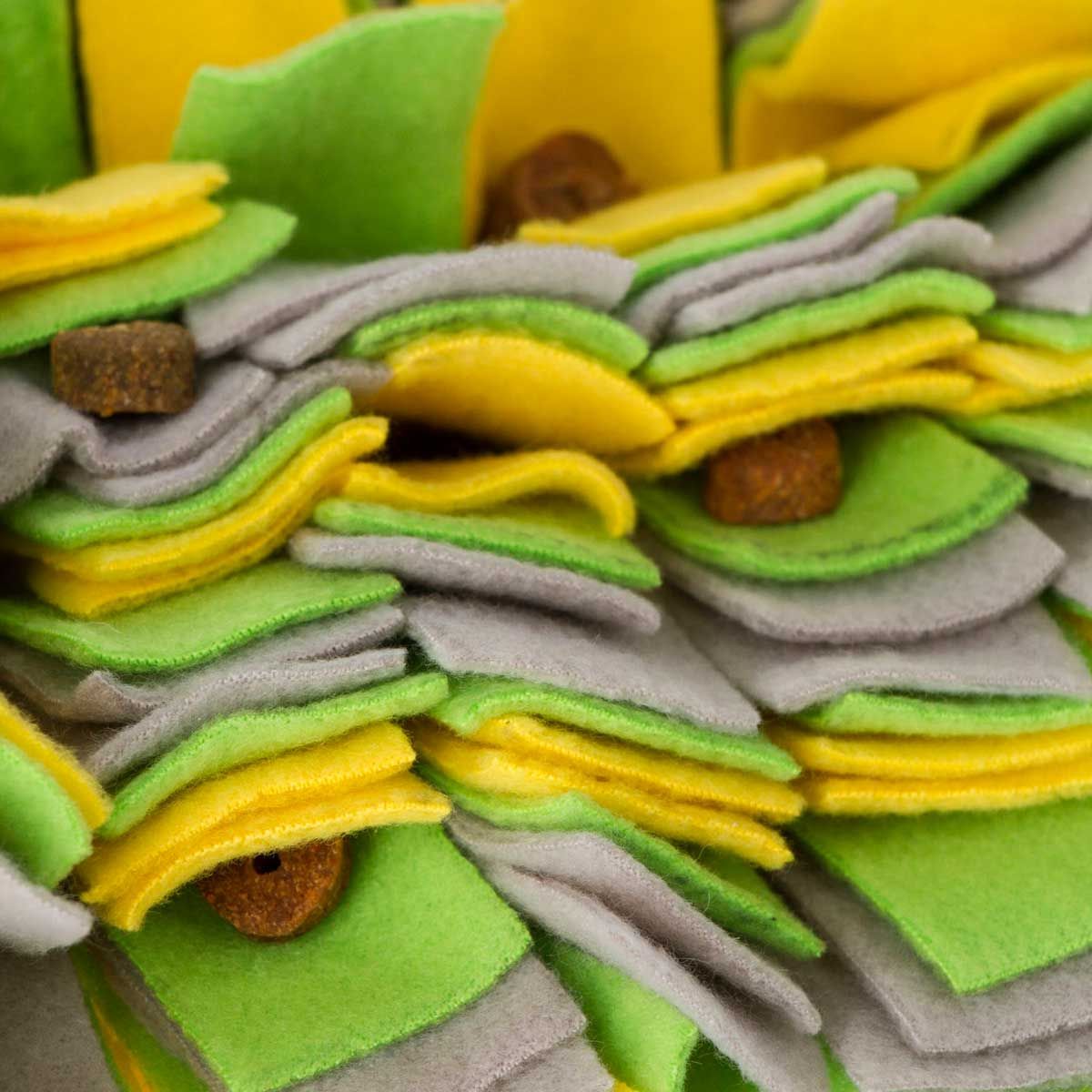 Der Hunde Schnüffelteppich bietet viele verschiedene Möglichkeiten Trockenfutter, Leckerlies oder Spielzeug zu verstecken und somit Ihren Hund stundenlang zu beschäftigen.