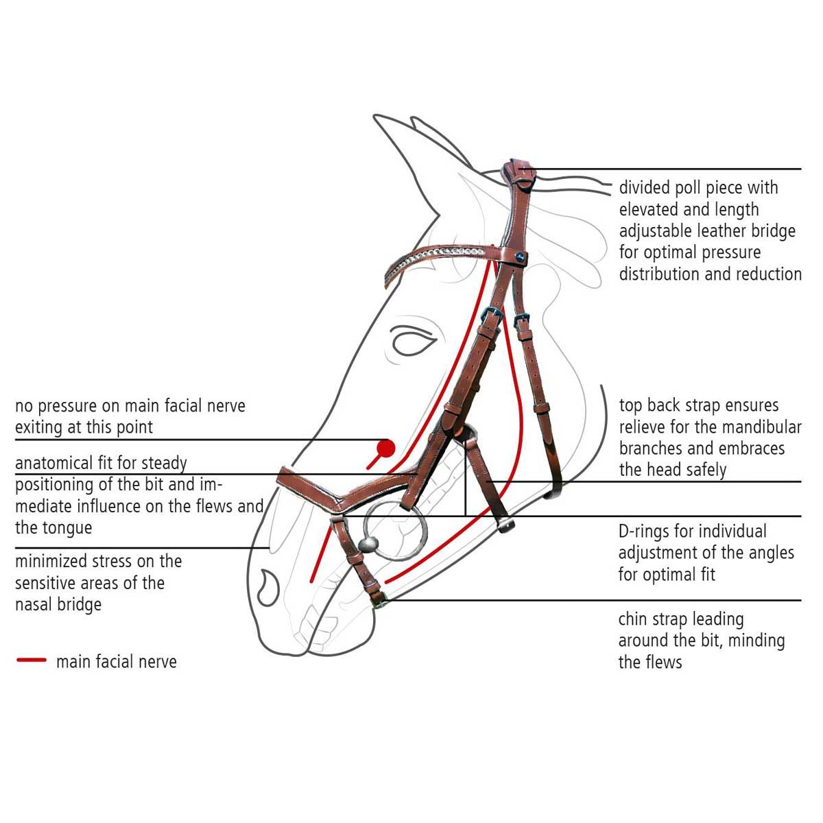 - Reglabilitate maximă a dimensiunilor și posibilitatea de a schimba unghiurile pentru o adaptare ideală la anatomia capului fiecărui cal în parte
