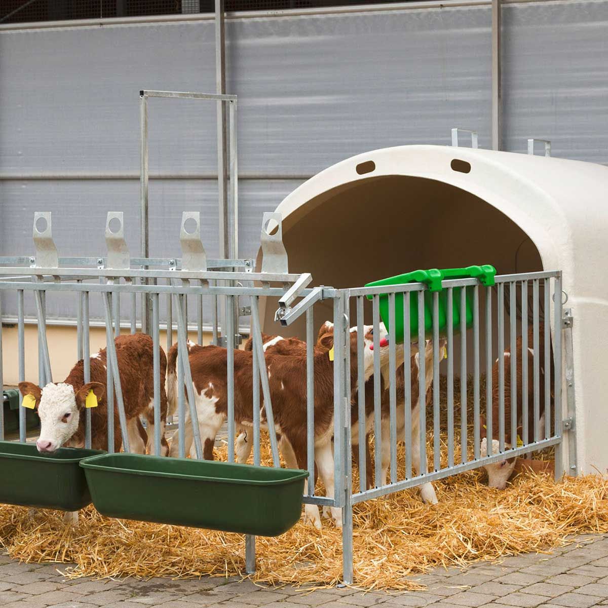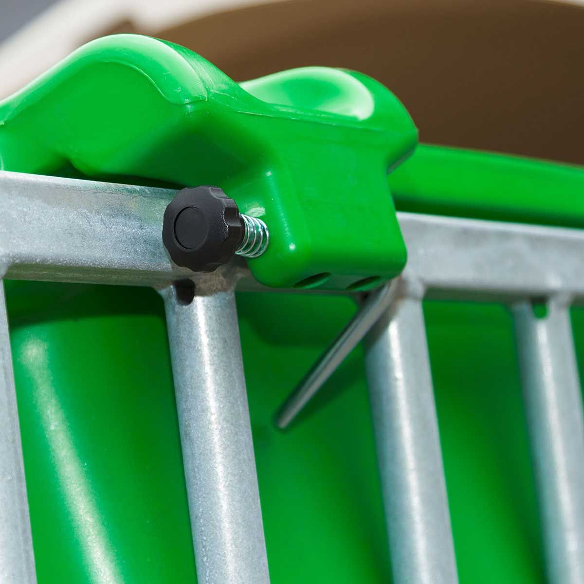 Cele 5 bucăți de super tetine cu supape cu șurub, testate și verificate, sunt potrivite pentru toți vițeii. Cu o închidere ușor de manevrat de tip "turn-and-snap", alimentatorul este fixat ferm pe pereții grajdurilor, pe gardurile de furaje, pe garduri și pe țevi până la un ø maxim de 61 mm (2"). Colțurile rotunjite facilitează curățarea. Alimentatorul pentru viței este stivuibil și poate fi transportat cu ușurință.