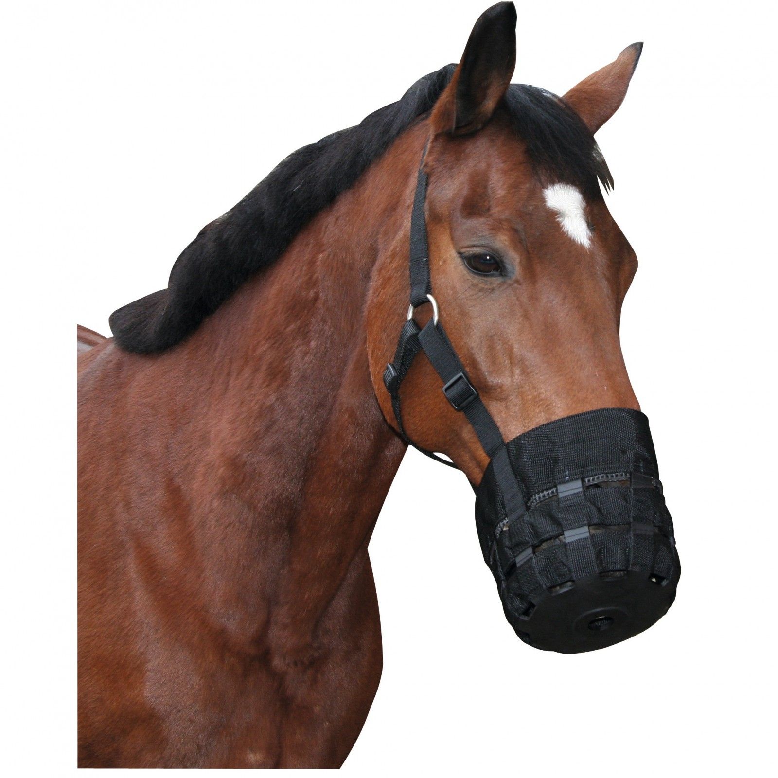 Această botniță cu ștreang integrat împiedică calul dumneavoastră să mănânce prea repede la pășune și este ușor de atașat. Zona botului este foarte bine întărită.