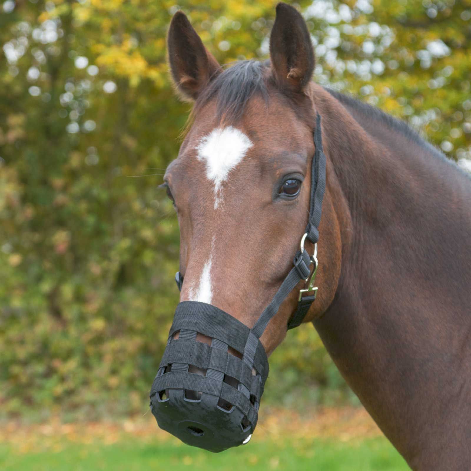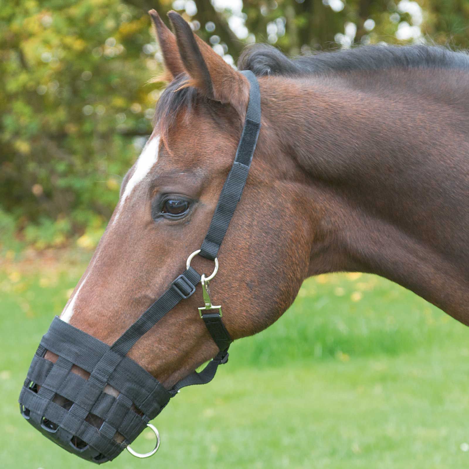 Această botniță cu ștreang integrat împiedică calul dumneavoastră să mănânce prea repede la pășune și este ușor de atașat. Zona botului este foarte bine întărită.
