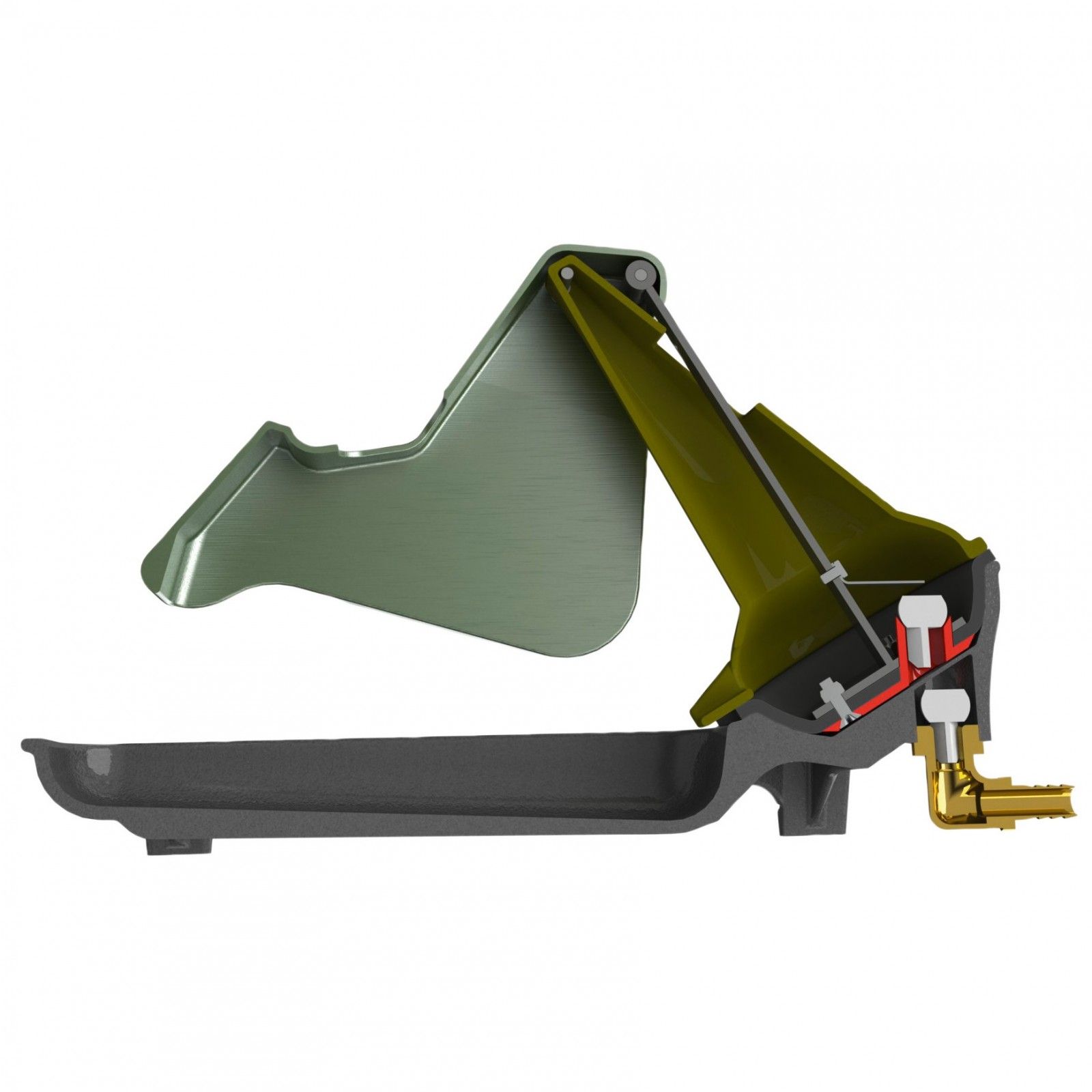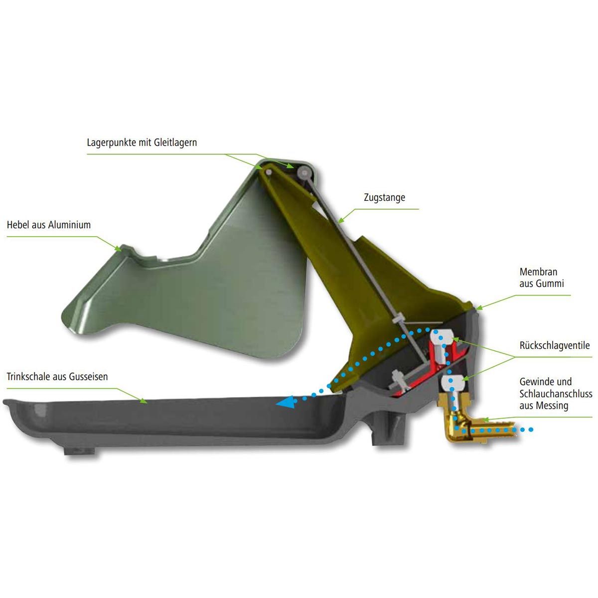 Pârghia este împinsă înainte de capul animalului. Tija de tracțiune ridică membrana și aspiră apa în spațiul membranei. Din cauza gravitației și a tensiunii din membrană, pârghia se deplasează din nou înapoi. Apa este deplasată din spațiul membranei și curge în bolul de băut. Supapele de reținere asigură faptul că apa este întotdeauna aspirată și pompată în direcția corectă. O parte din apa pompată rămâne în partea superioară a membranei și se scurge în vasul de băut imediat ce membrana este acționată din nou în ciclul următor, adică atunci când animalul apasă din nou pe pârghie (funcție de dublă cursă).