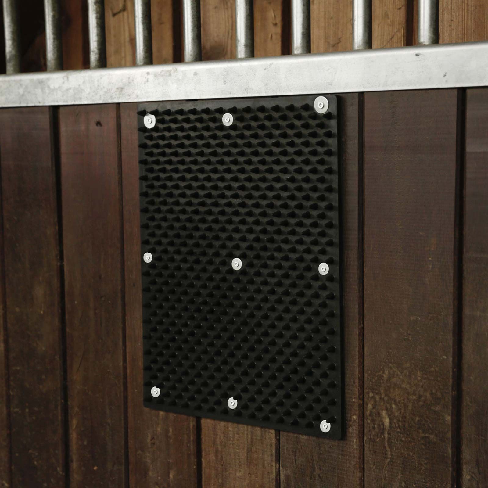 O formă dreptunghiulară cu multe găuri de montare asigură o montare stabilă pe grajduri, pereți sau stâlpi. Posibilități de aplicare multifuncțională, de exemplu, pe perete sau în jurul stâlpilor, stâlpilor sau colțurilor. Acest covoraș de scărpinat este, de asemenea, ideal pentru alte specii de animale care au o nevoie naturală de a se scărpina, cum ar fi caprele.