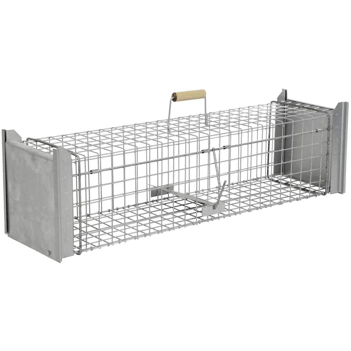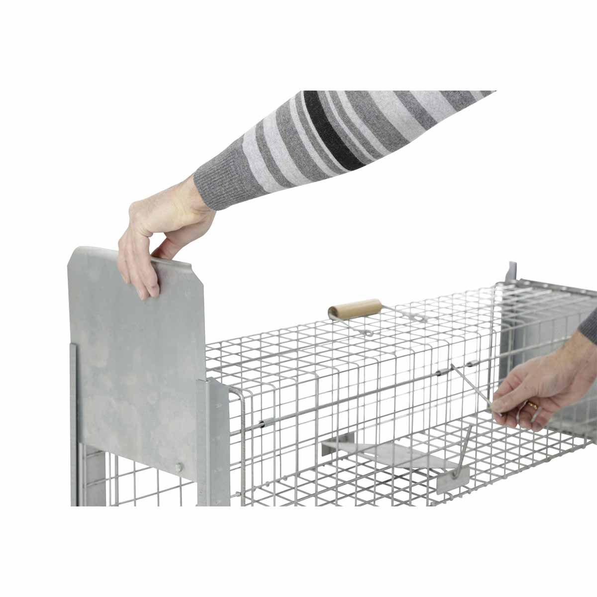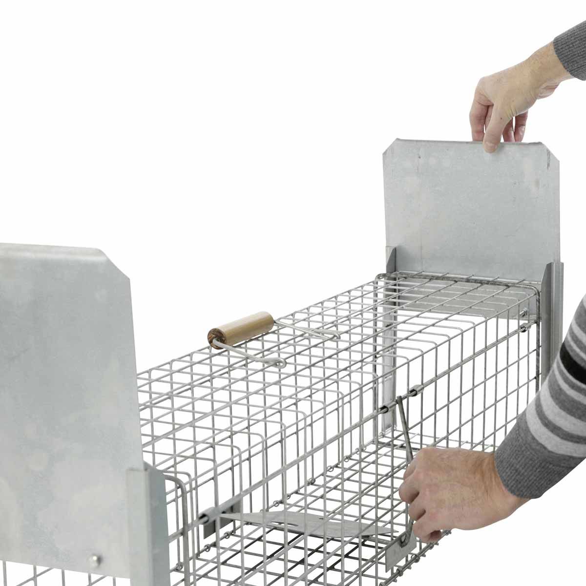 - Caracteristica specială a capcanei 118 x 33 x 42 cm: ușa amplasată central facilitează plasarea momelei în apropierea plăcuței de tragere.