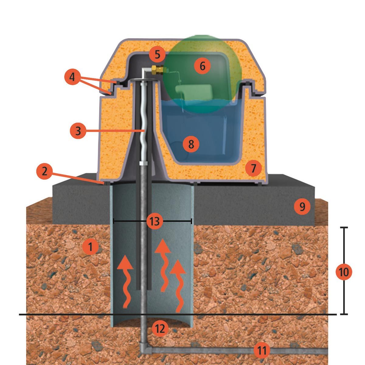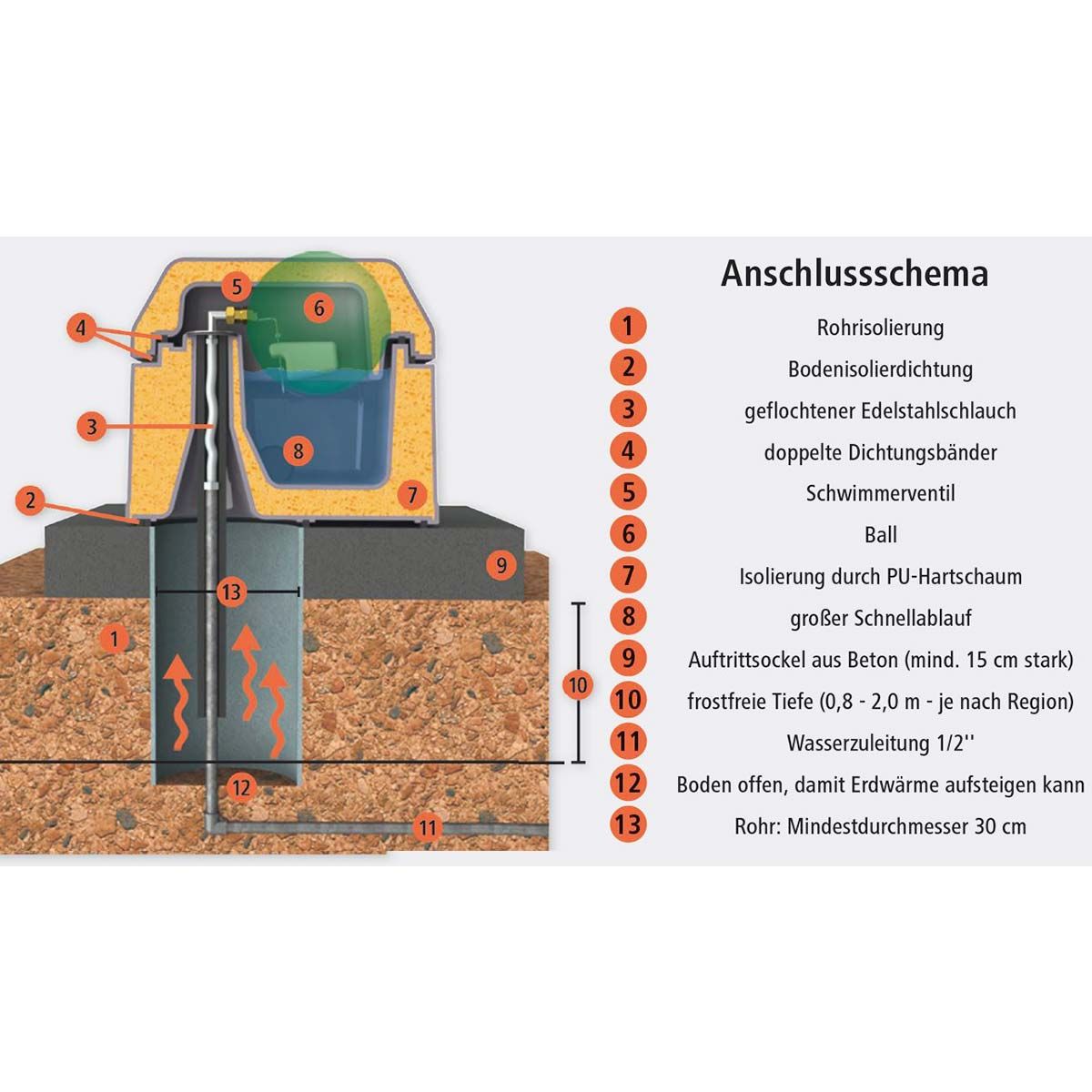 Odată ce dozatorul este umplut, bilele închid orificiile de băut și mențin astfel apa curată și la o temperatură plăcută. Pentru a absorbi apa, animalele trebuie doar să apese pe minge. O supapă cu plutitor asigură umplerea automată a apei proaspete (până la 35 l/min), care intră în adăpător deja la temperatura solului (3-5 °C iarna, 10-12 °C vara) prin conducta de alimentare amplasată la adâncimea solului fără îngheț. Carcasa cu pereți dubli, umplută cu spumă termică, oferă un nivel ridicat de protecție împotriva frigului și căldurii și menține temperatura apei la un nivel confortabil pentru animale.
