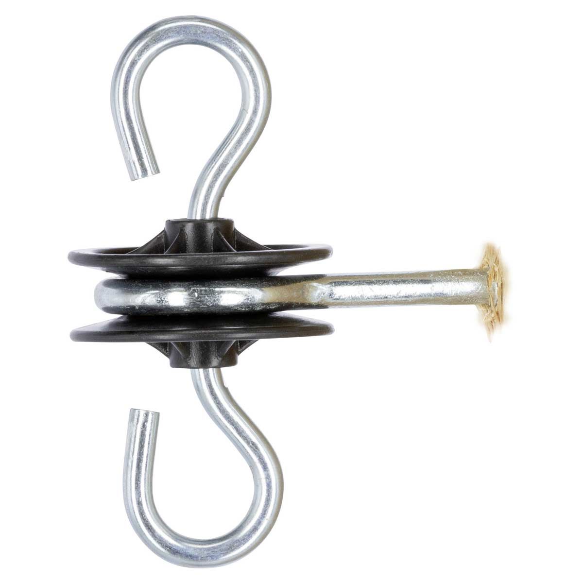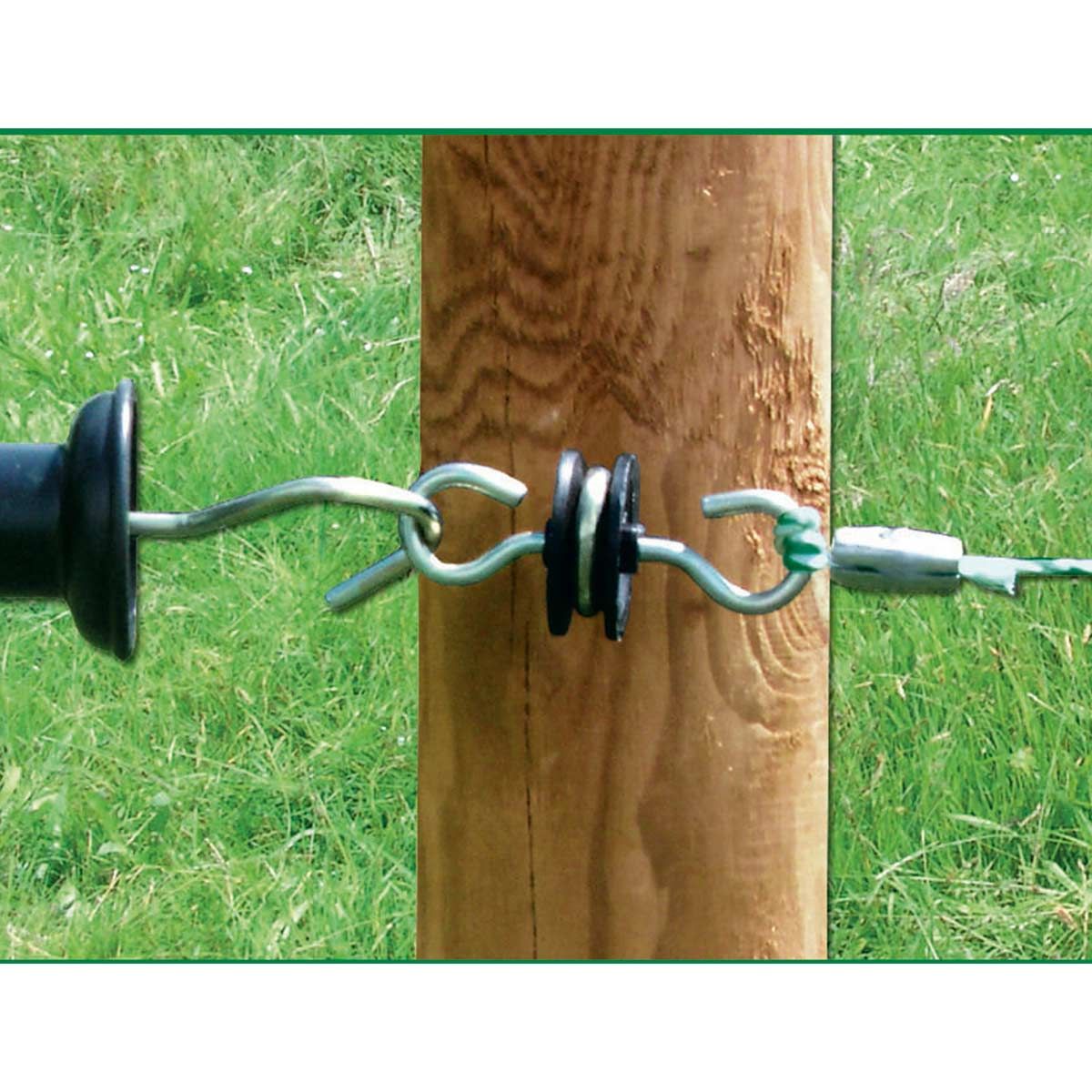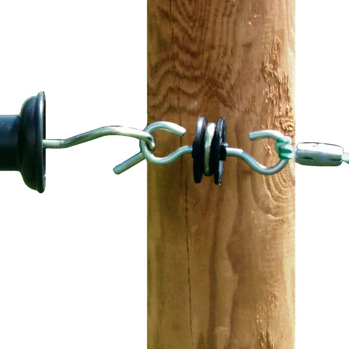 Izolatorul pentru mânere de poartă cu 2 cârlige de ancorare este foarte robust și cu firul său de lemn de 6 mm pentru agățarea mânerelor de poartă pe ambele părți. Cârligele de inserție sunt ideale pentru agățat sau pentru mânerul porții și materialul scării.