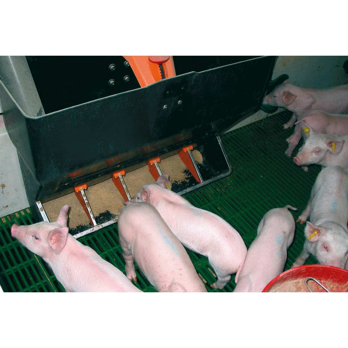 Alimentatorul automat TR-5 controlează în mod convenabil și precis hrănirea purceilor dumneavoastră. Hrana pentru porci este distribuită în 12 poziții, chiar și cu un buncăr plin. Cu ajutorul sistemului de racletă internă, alimentarea poate fi dozată în mod ideal sau chiar oprită complet. Cu margine de protecție împotriva mușcăturilor din oțel inoxidabil. Este igienică și ușor de curățat, deoarece nu are colțuri în care să poată rămâne mâncare.