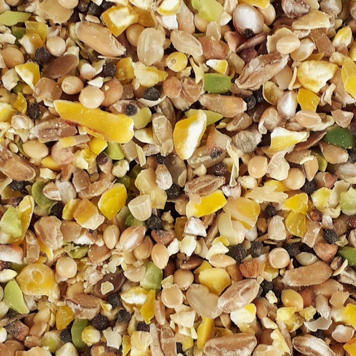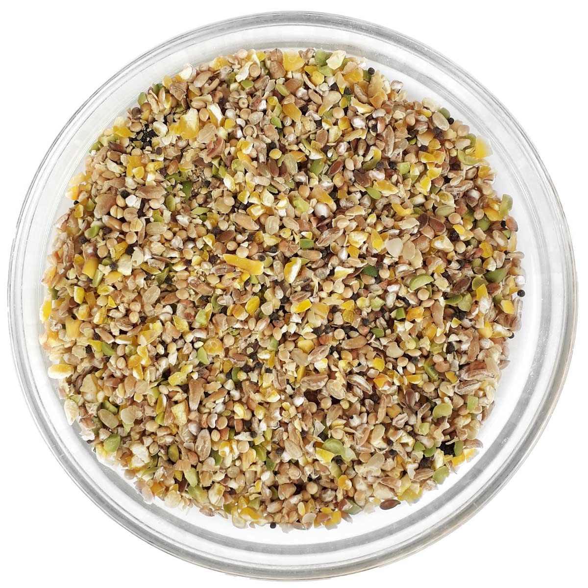 Compoziție: semolă de porumb, grâu măcinat grosier, făină de extracție de soia (fasole) cu săpun (încălzită cu abur), boabe de milo, mei galben, mazăre verde mică, carbonat de calciu, nisip de coajă, semințe de in, nap negru, fosfat monocalcic, ulei de floarea-soarelui.