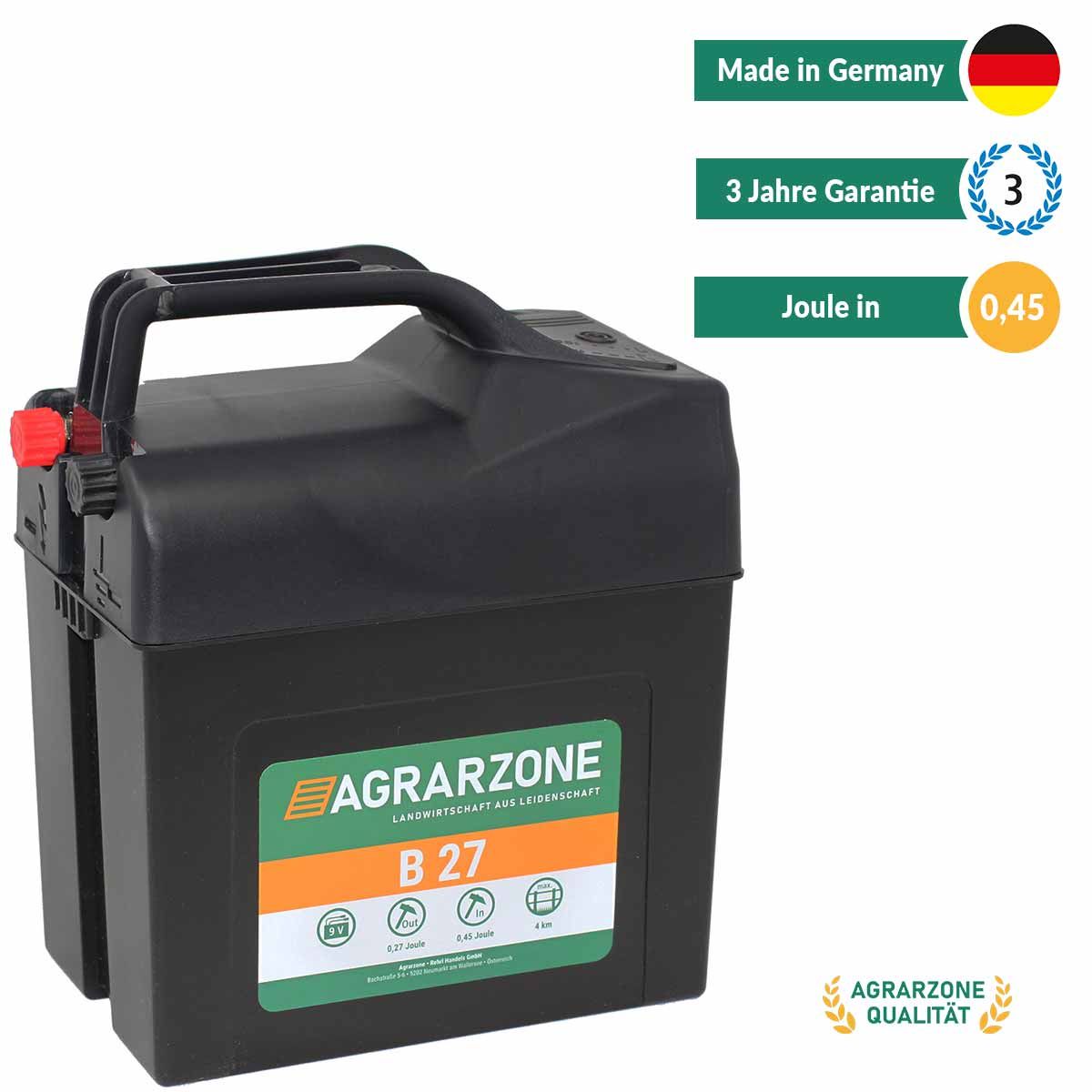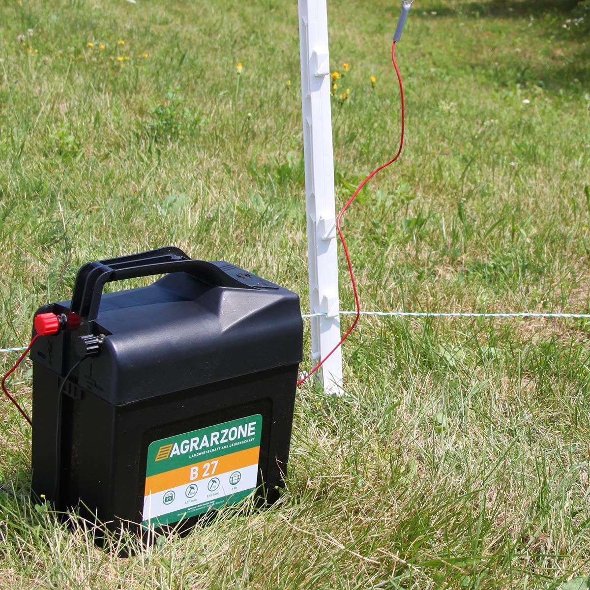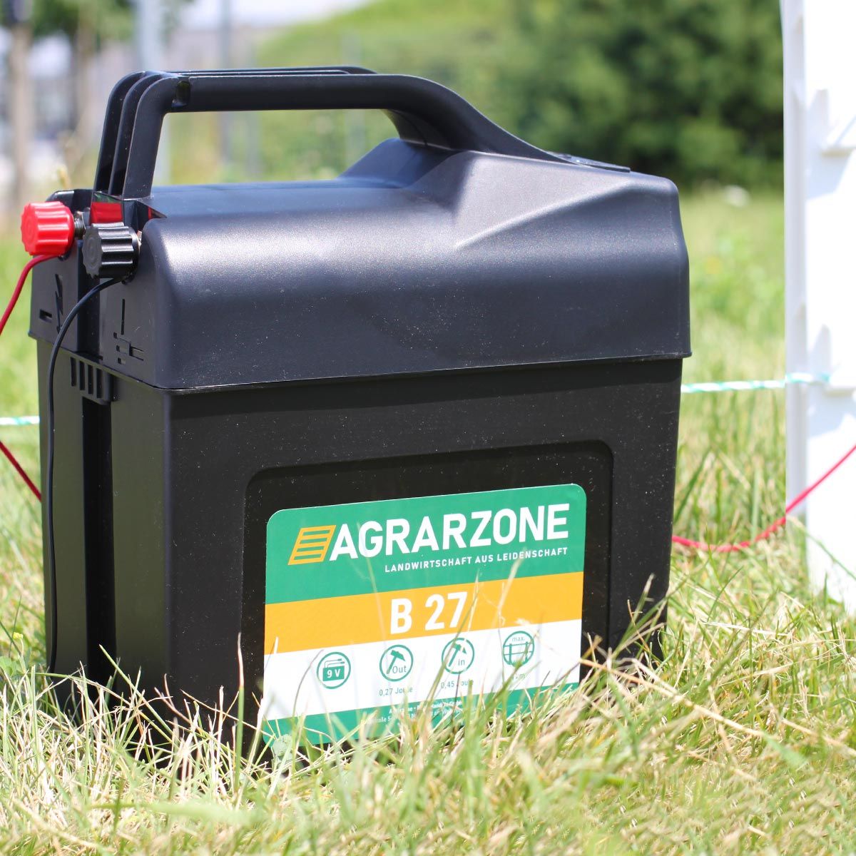 Cu ajutorul generatorului de impulsuri de gard electric de 9 V / 12 V Agrarzone B 27, sistemele de garduri mobile pot fi construite în cel mai scurt timp. Fie că este vorba de pășuni mici pentru cai și vite sau de animale mici, cum ar fi câinii și pisicile - dispozitivul universal alimentat cu baterii garantează o utilizare ușoară pentru toată lumea datorită unei lumini de control a bateriei cu LED . Un cablu de conectare, precum și o tijă de împământare sunt incluse în pachetul de livrare al unității de pășunat cu baterii ieftine, care este ideală pentru utilizarea mobilă.