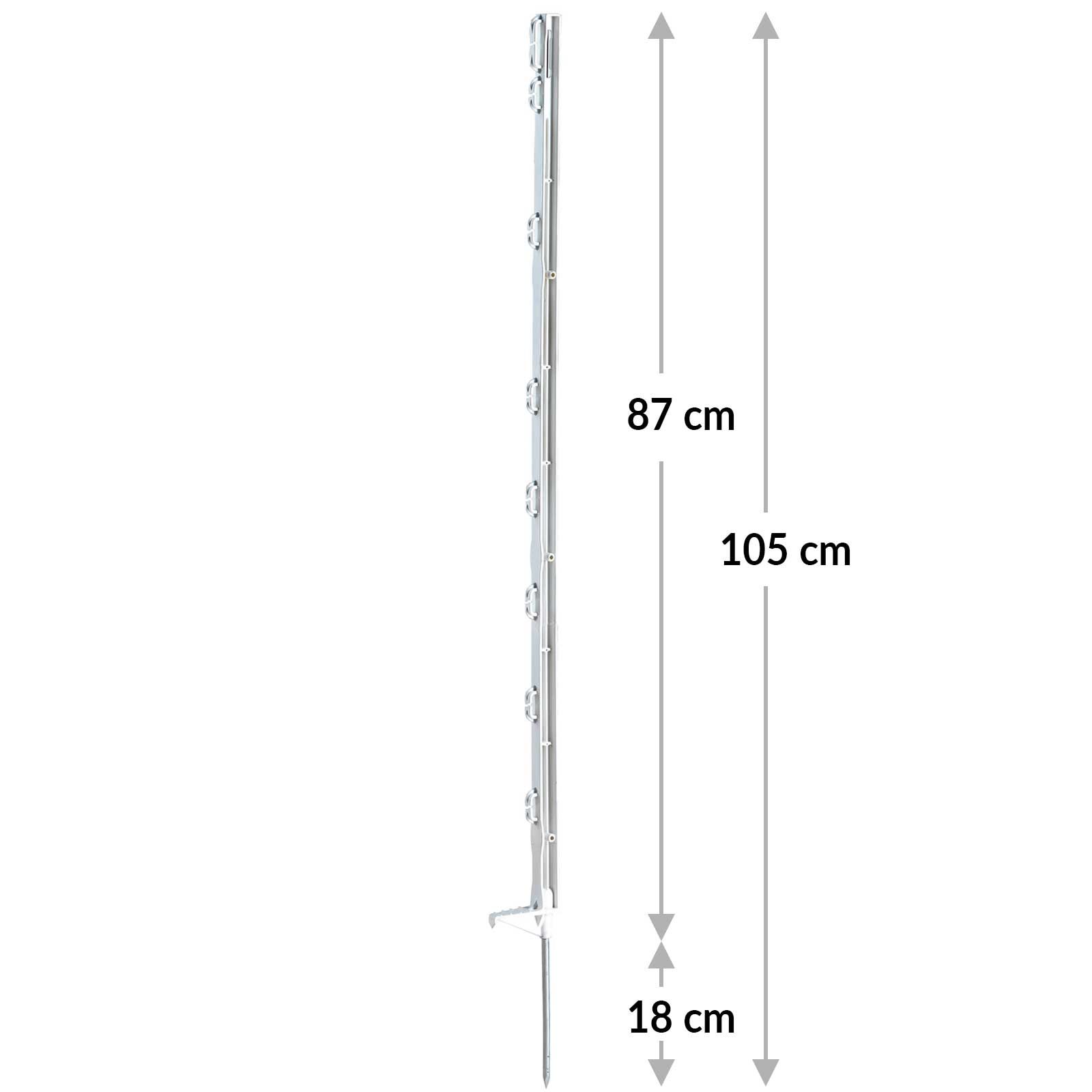Banda de rulare lată și protecția integrată împotriva răsucirii facilitează instalarea țărușilor și asigură fixarea sigură a acestora în sol. Cu un ochi pentru benzi de până la 4 cm și 7 ochi pentru frânghii, șnururi și benzi de până la 2 cm, țărușii din plastic sunt flexibili în utilizare. Stâlpii pentru gardul de pășune vă oferă mai multe moduri diferite de a vă ridica gardul. Cuiul de sol galvanizat cu lungimea de 18 cm asigură o stabilitate suplimentară și previne alunecarea stâlpilor. Chiar și după repoziționări repetate, stâlpii din plastic rămân stabili și neclintiți.