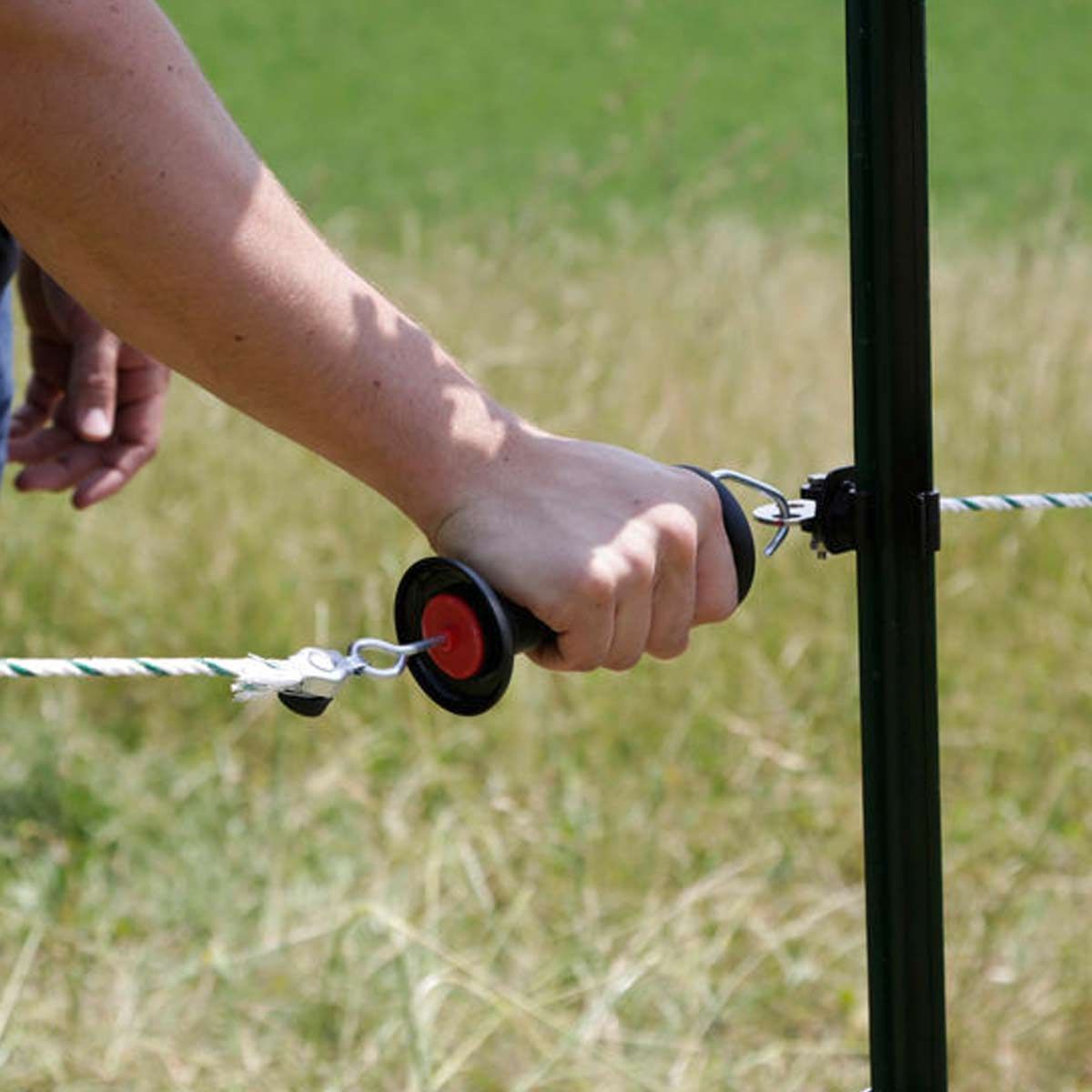 Pentru a evita conexiunile/atașările defectuoase la mânerele porților prin înnodarea materialului conductor al gardului de pășune, noul conector de cablu este ideal pentru a conecta materialul conductor la mânerul porții. Puteți introduce pur și simplu cordonul, frânghia sau firul gardului de pășune în conexiune și îl puteți fixa cu ajutorul șurubului de fixare fără să alunece. Banda pentru gard electric nu este deteriorată și poate fi desfăcută din nou foarte ușor datorită șurubului.
