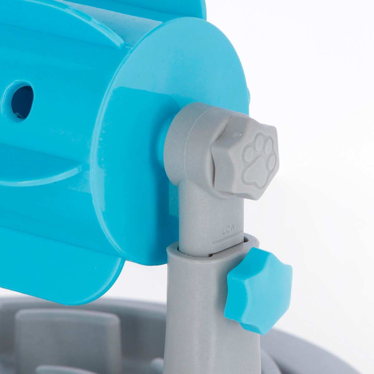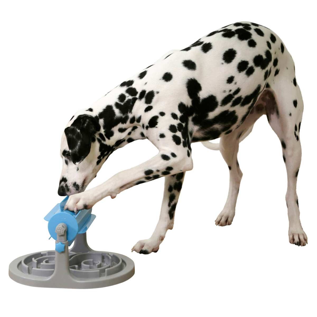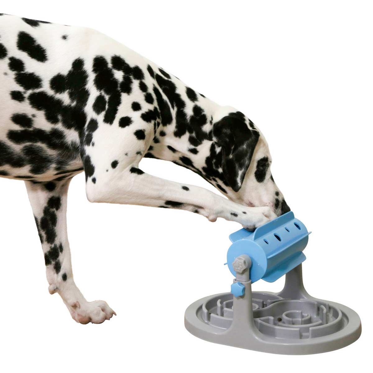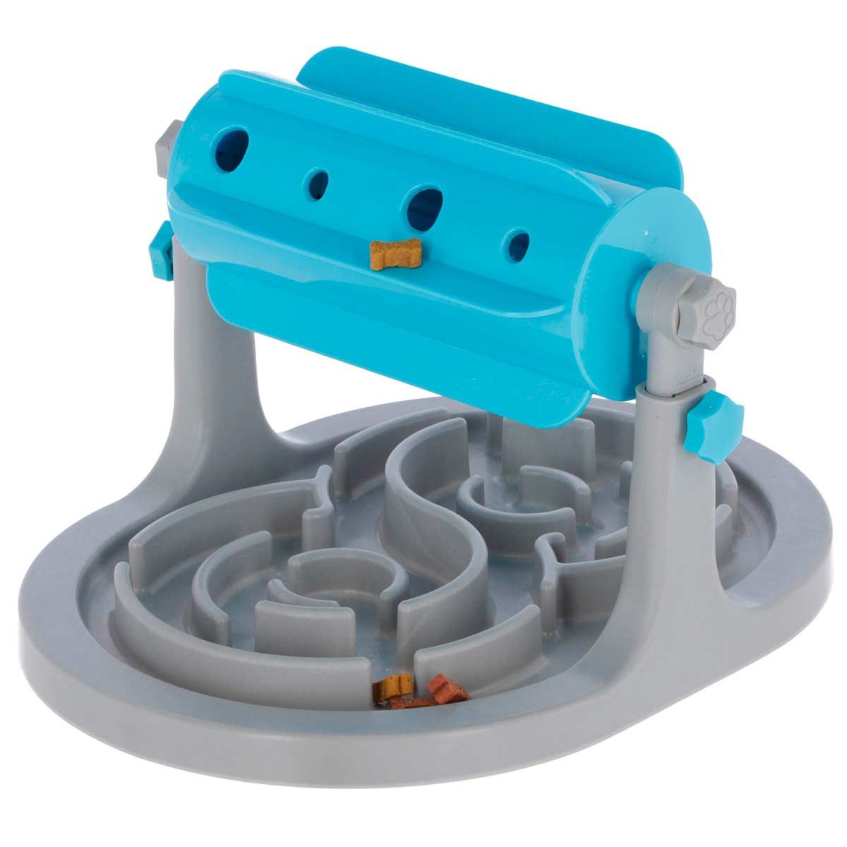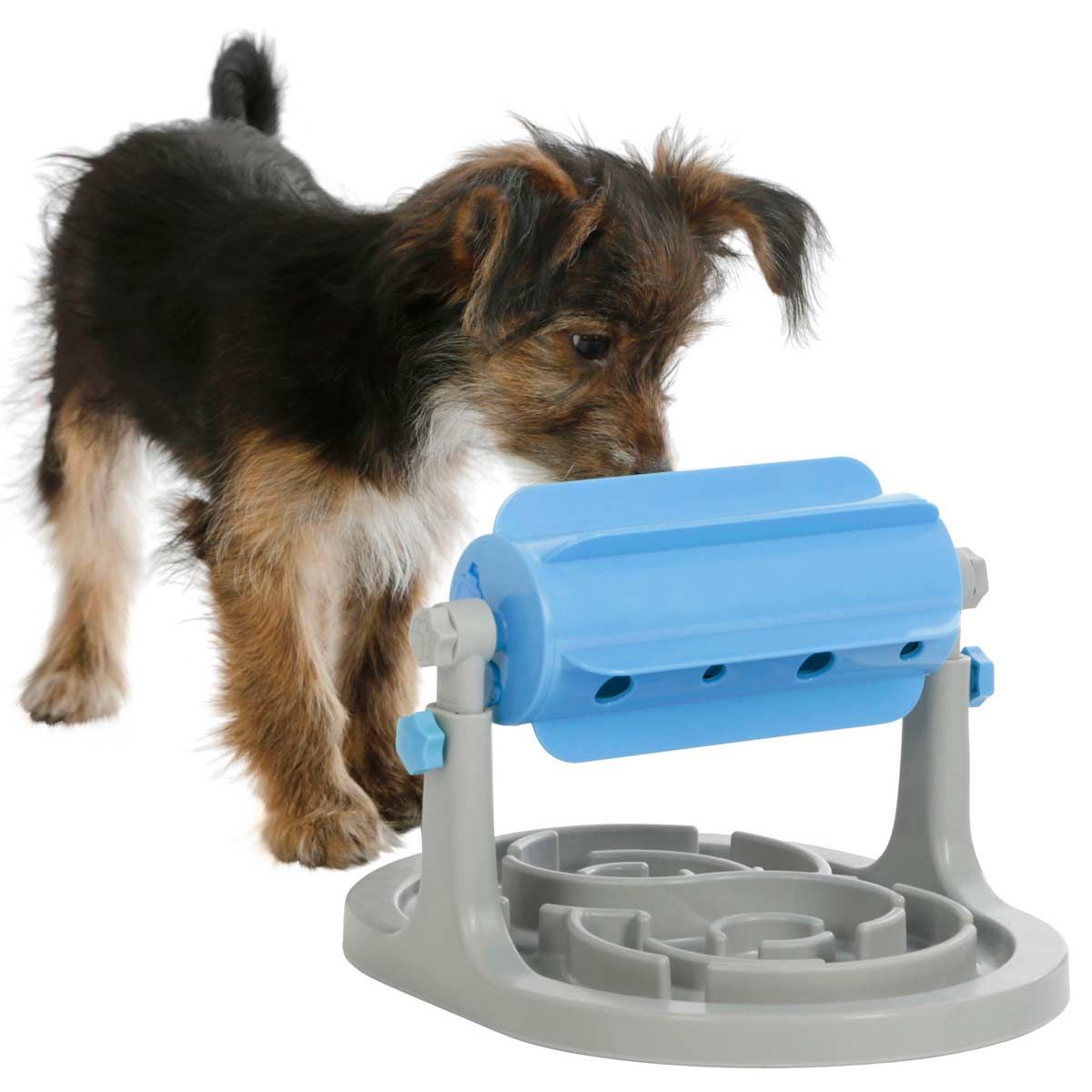 - Durch Drehung der Rolle fallen die Snacks heraus in den Anti-Schling Teller
