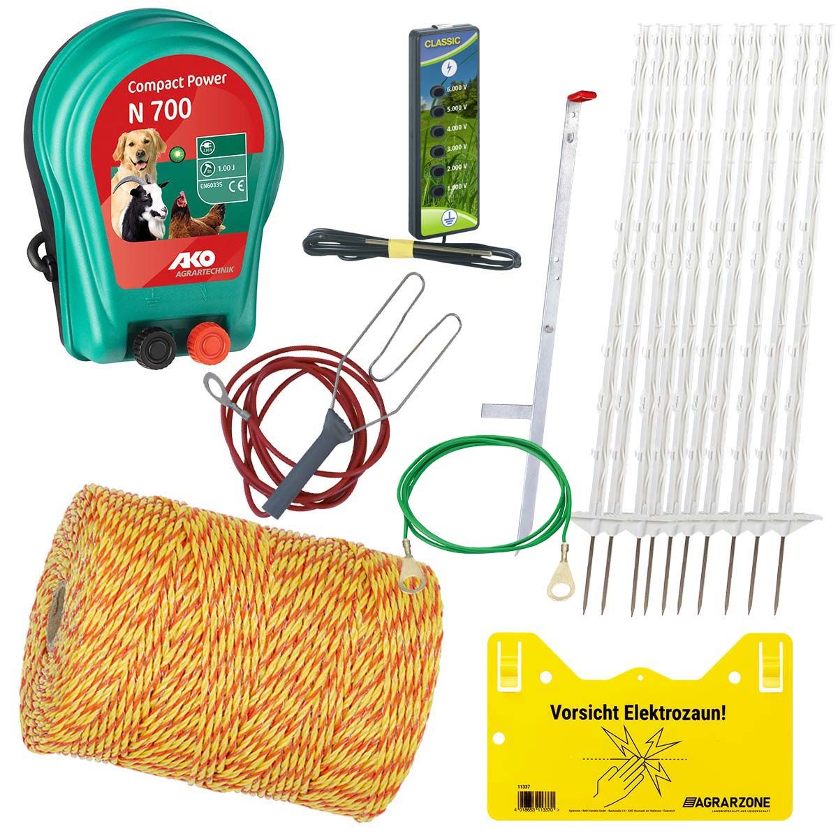 Setul include gardul electric AKO de 230 de volți N700 cu putere redusă, care a fost dezvoltat în special pentru a permite păstrarea animalelor de companie și a animalelor mici în funcție de specie. Setul include, de asemenea, 250 m de cablu de gard de împrejmuire foarte vizibil și 10 stâlpi de plastic cu 8 ochiuri pentru fixarea sârmei. Acest lucru vă permite să ajustați înălțimea și lungimea gardului pentru a se potrivi nevoilor dumneavoastră individuale, fiind posibile până la 8 rânduri sau 250 m în lungime!