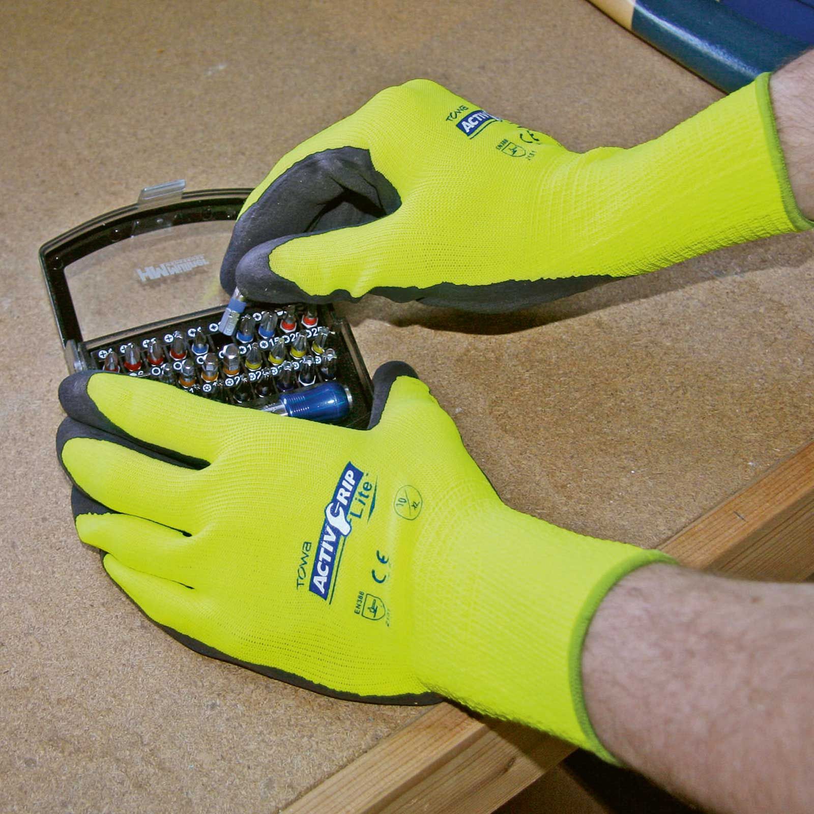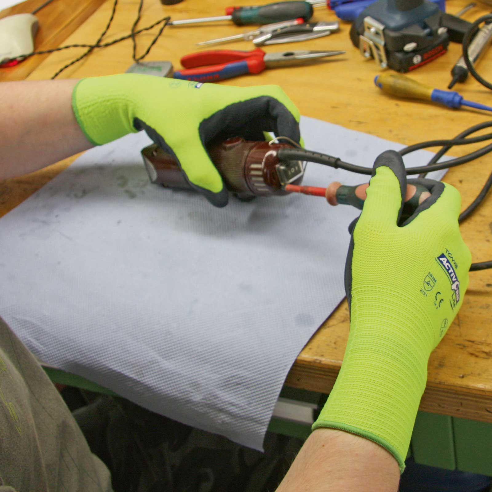 Mănușile din poliester tricotate fin (13 gauge ) sunt înmuiate în latex pentru o rezistență suplimentară la alunecare. Părțile dorsale ale mâinilor și degetele sunt libere, dar degetul mare este complet învelit. Palma mănușilor de lucru este tratată cu"MicroFinish", ceea ce le face deosebit de aderente și asigură o potrivire foarte bună și o senzație specială la nivelul degetelor. Mănușile sunt respirabile și sunt spălate pentru a proteja împotriva alergiilor la latex.