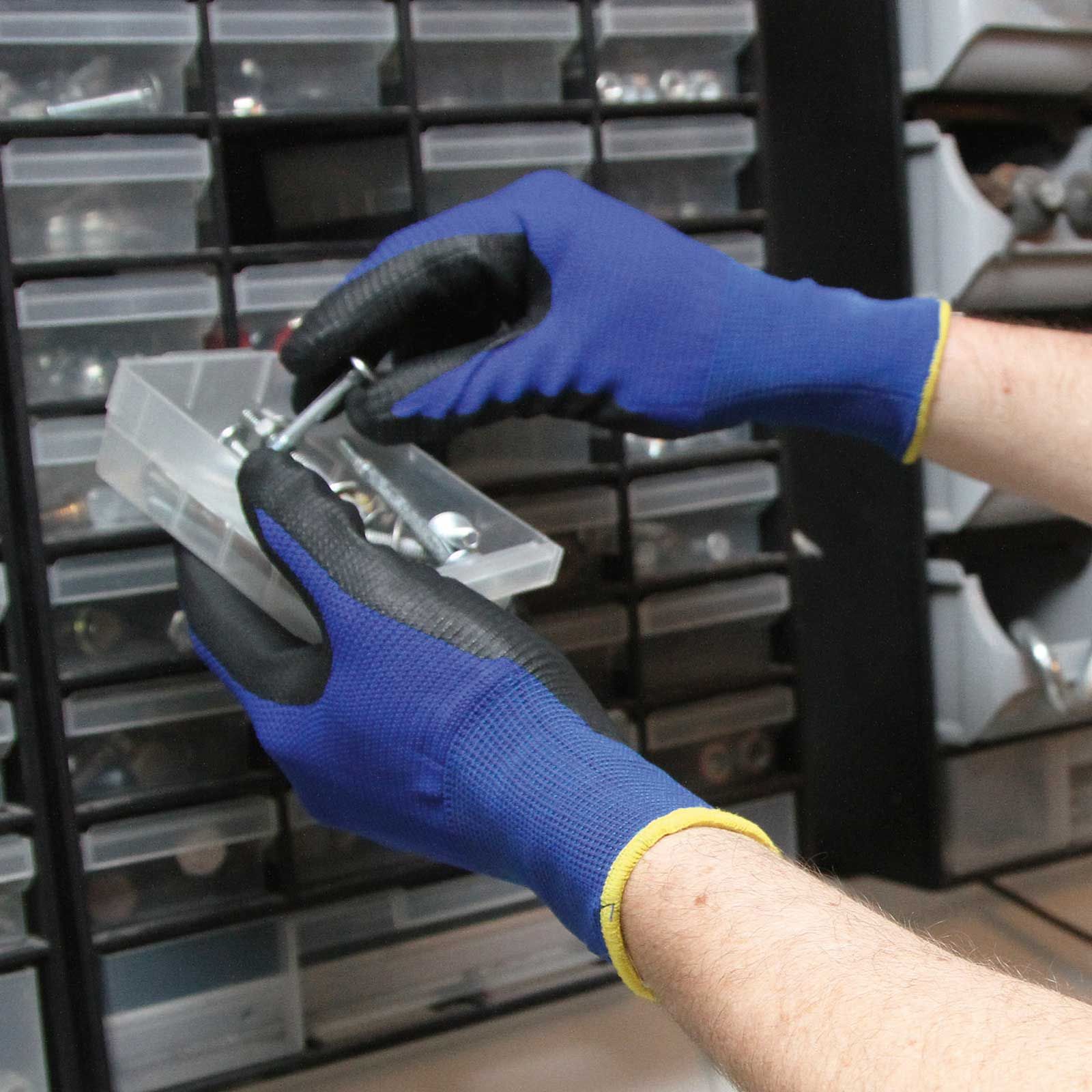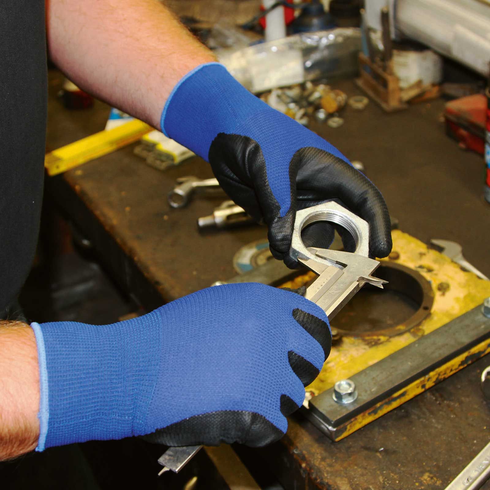 Mănușa din nailon (13 gauge), fără cusături și cu tricotare U3, este tricotată într-un model ondulat, care previne oboseala mâ inii, ventilează bine mâna și asigură o aderență foarte bună. Mănușa de lucru are un strat impermeabil din spumă de nitril rezistentă la abraziune și moale, ceea ce o face deosebit de aderentă chiar și în condiții uscate, umede sau uleioase. Forma excelentă și ergonomică îl face potrivit pentru o utilizare pe termen lung. Mănușa din tricot fin este testată în conformitate cu EN 388 / CAT II și este utilizată în principal în ingineria mecanică, în industria auto și pentru lucrări de asamblare.
