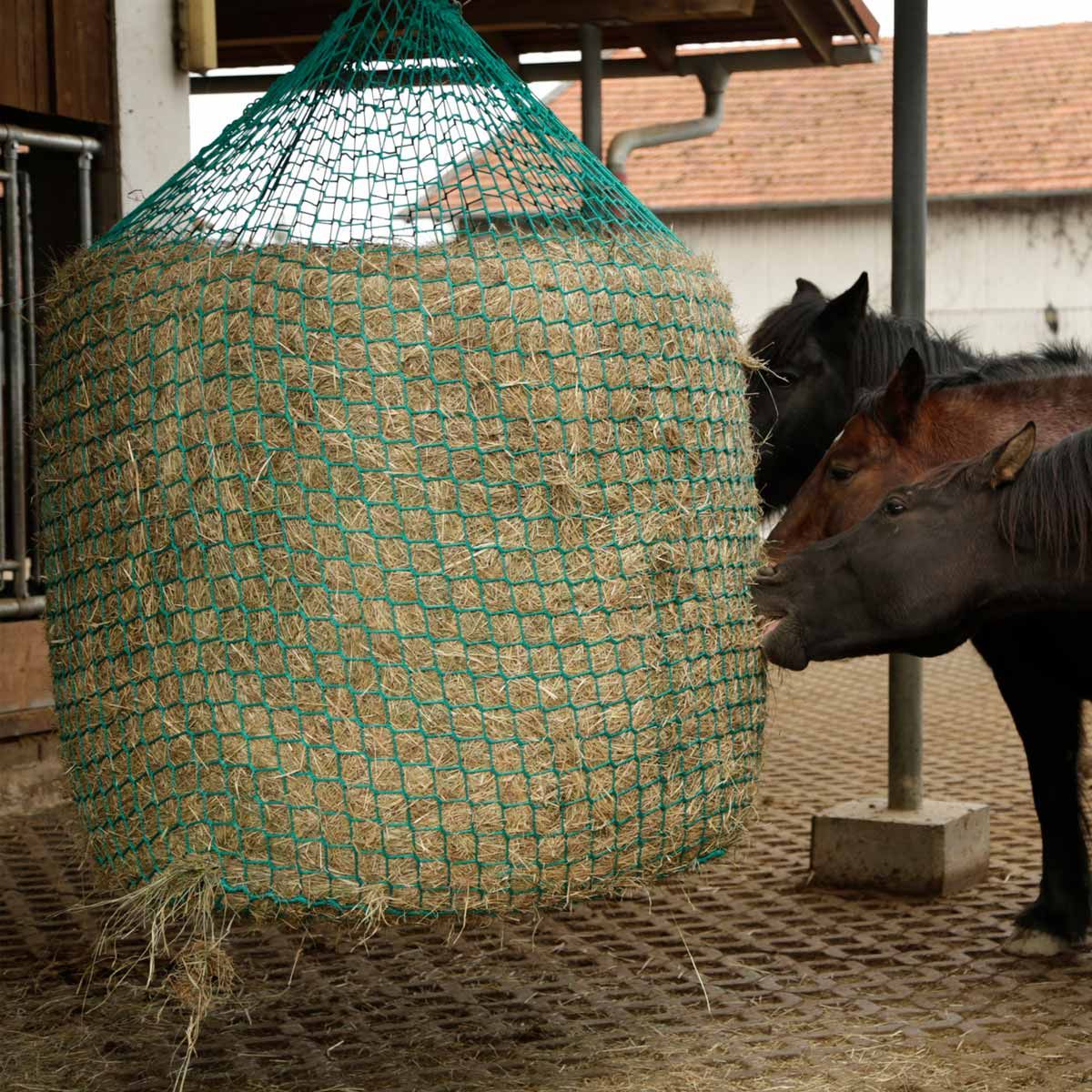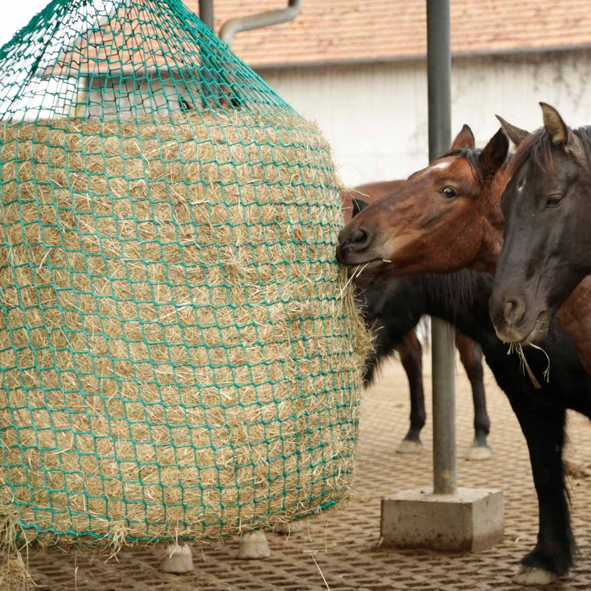 Plasă de fân pentru agățarea pretensionării baloților de fân și de siloz pentru alimentarea cu furaje grosiere a cailor, cu economie de furaje.