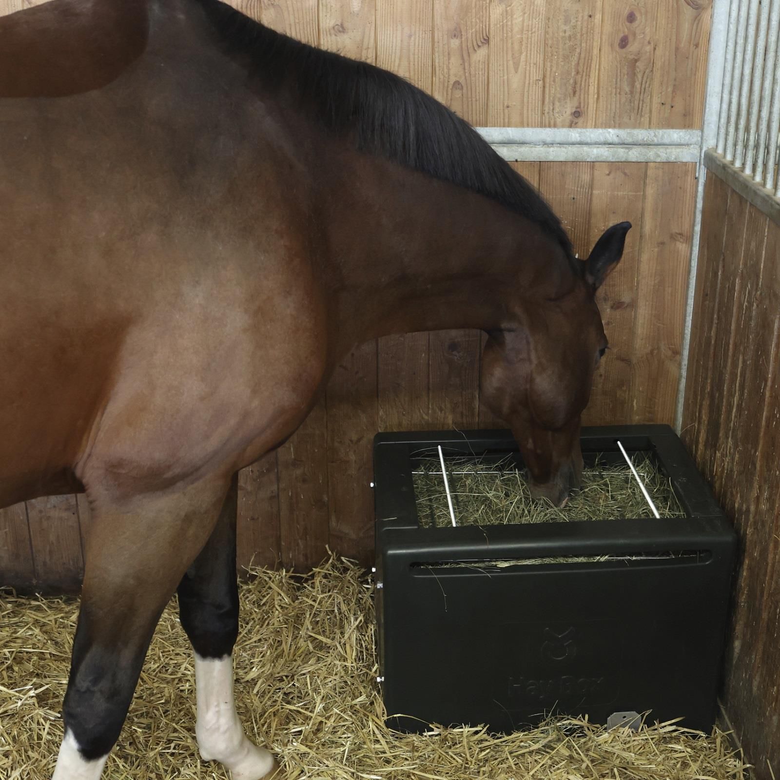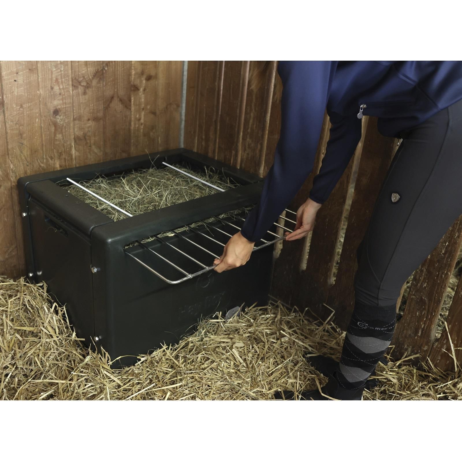 Cutia de fân este utilizată pentru hrănirea cailor în funcție de specie. Datorită cadrului de plasă stabilă cu deschideri de hrănire de 4,5 cm , aportul de hrană este lent, dar constant și poate contribui astfel la bunăstarea calului. Datorită hrănirii lente, există mai puține probleme comportamentale și digestive decât în cazul hrănirii normale cu fân. Cutia de fân de la Kerbl este proiectată pentru aproximativ 8-10 kg de fân. Dacă este necesar, suportul de fân HayBox poate fi atașat la podea sau la perete cu ajutorul accesoriilor corespunzătoare. Cadrul poate fi înlocuit cu o plasă de fân, inclusiv cadrul, dacă este necesar.