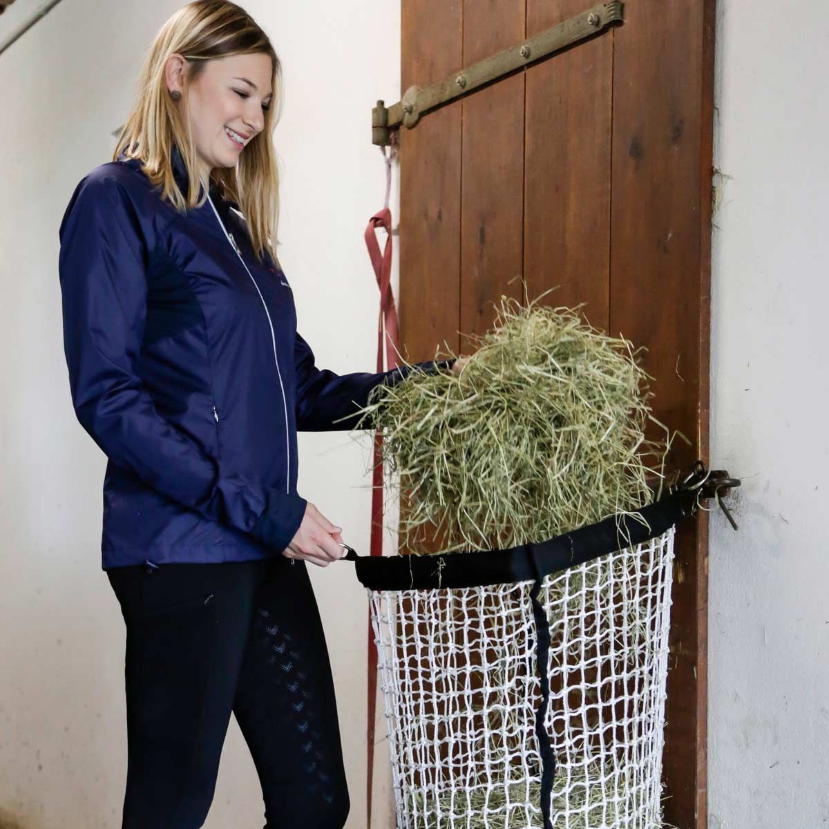 Plasă de fân dreptunghiulară cu cârlig de suspendare practic pentru o umplere ușoară. O închizătoare Velcro întărită la deschiderea plasei de fân împiedică calul să deschidă sacul de fân în mod neintenționat. Orificiile de hrănire foarte mici, de 3x3 cm, asigură o plăcere de hrănire îndelungată și un consum optim de hrană pentru animal.