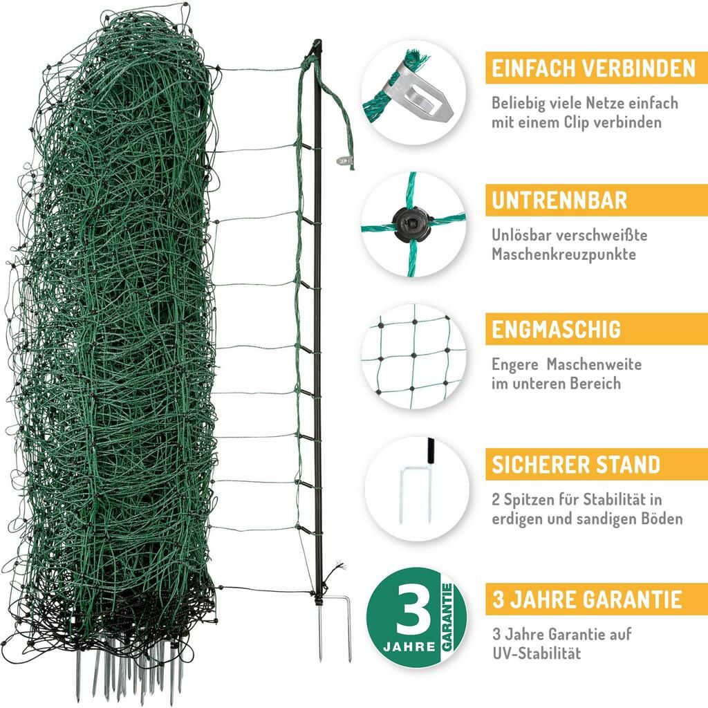 Setul complet include, de asemenea, o plasă de gard verde de 50 m pentru capră. Plasa robustă are o înălțime de 108cm și este susținută de 14 țăruși din plastic cu vârf dublu. Această țepușă dublă asigură o mai mare stabilitate în solurile nisipoase și pământoase în comparație cu o singură țepușă. Dintre cele nouă fire de plastic, primele opt sunt vii. Firul de jos nu este sub tensiune pentru a nu întrerupe fluxul de curent prin ierburi. Plasa pentru capre are ochiuri deosebit de înguste, ceea ce face și mai dificilă evadarea animalelor care pășunează. Pentru împrejmuirea unor suprafețe mai mari de pășunat, puteți extinde cu ușurință plasa pentru capre cu alte plase. Fluxul optim de curent este asigurat și atunci când mai multe plase electronice sunt înșirate împreună până la o lungime maximă de aproximativ 600 m (fără vegetație).