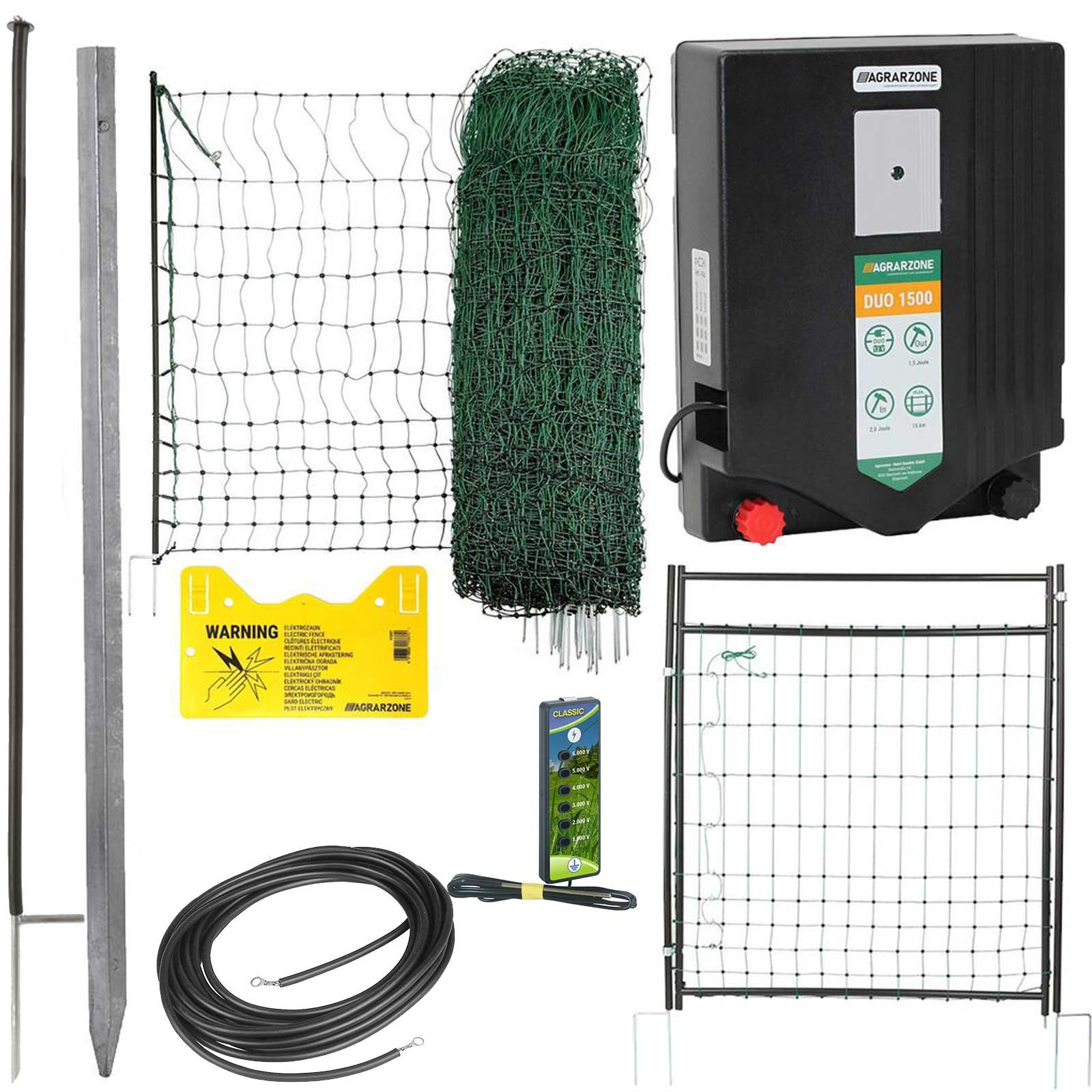 Agrarzone set complet de gard pentru păsări de curte - set de pornire mobil și puternic, cu poartă de pășunat, unitate de gard pentru pășunat și plasă de 50 m pentru păsări de curte.