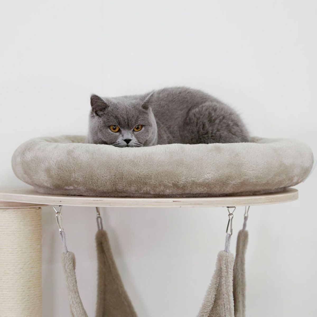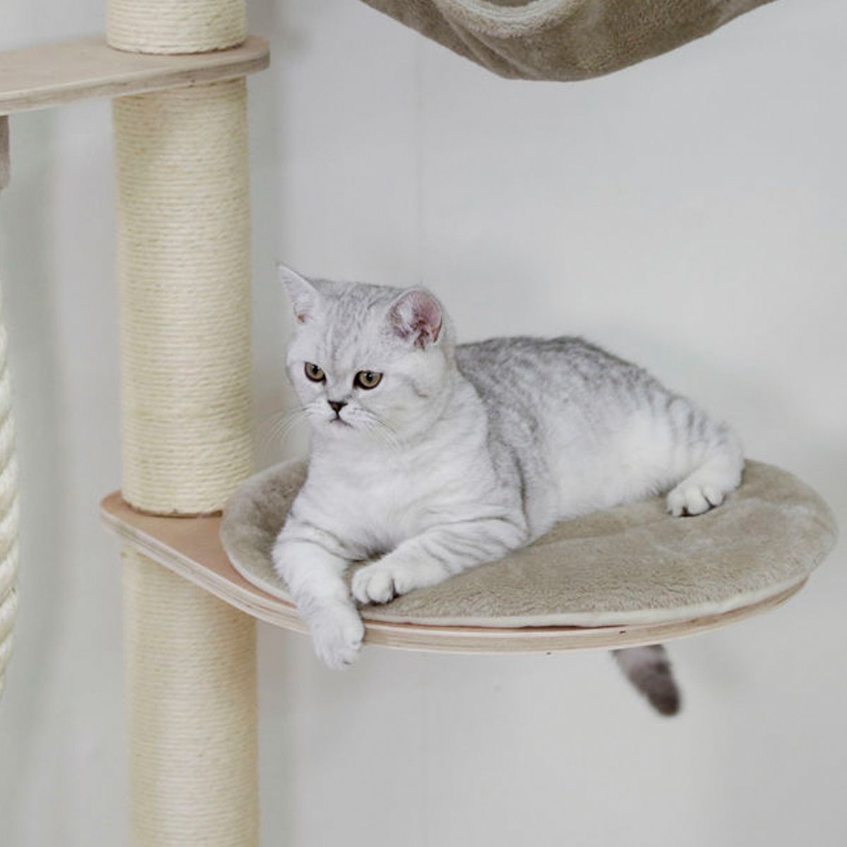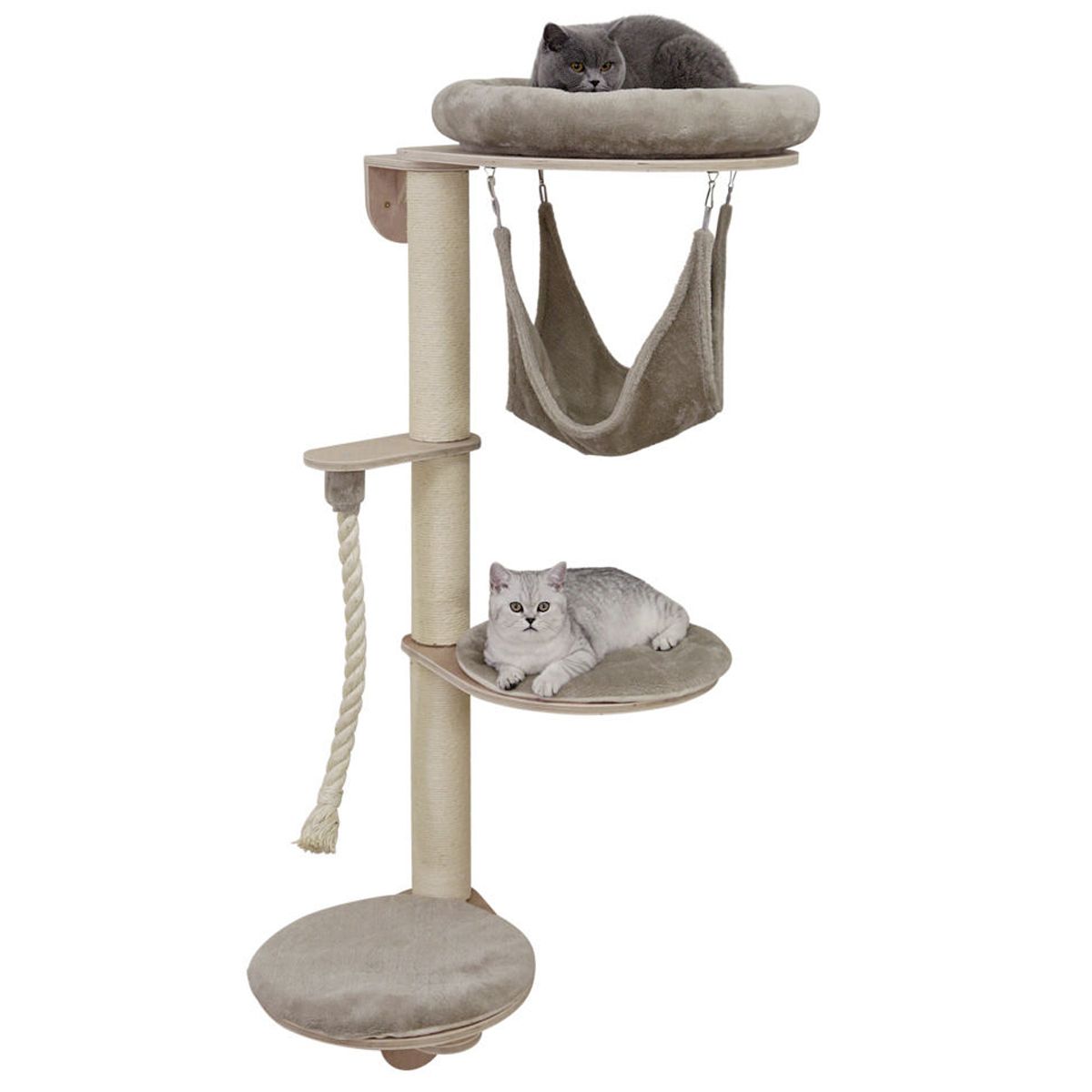 Der kreative Wandkratzbaum besteht aus mehreren Komponenten. Dazu gehören neben drei dicke, lange Sisalstamm zwei Liegeflächen, eine gemütliche Hängematte und eine Aussichtsplattform mit Kuschelbett. Die Kissen können abgenommen werden und sind bei 30°C waschbar.