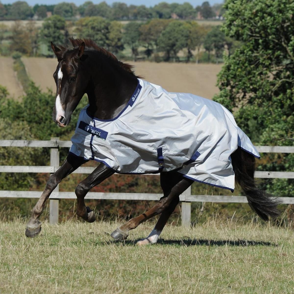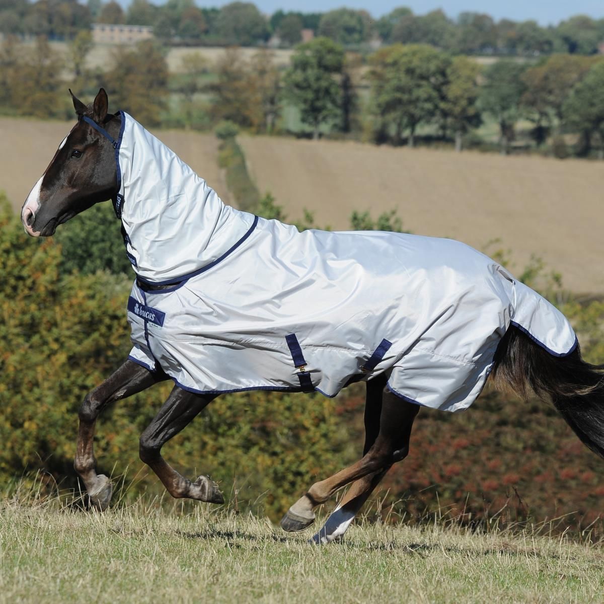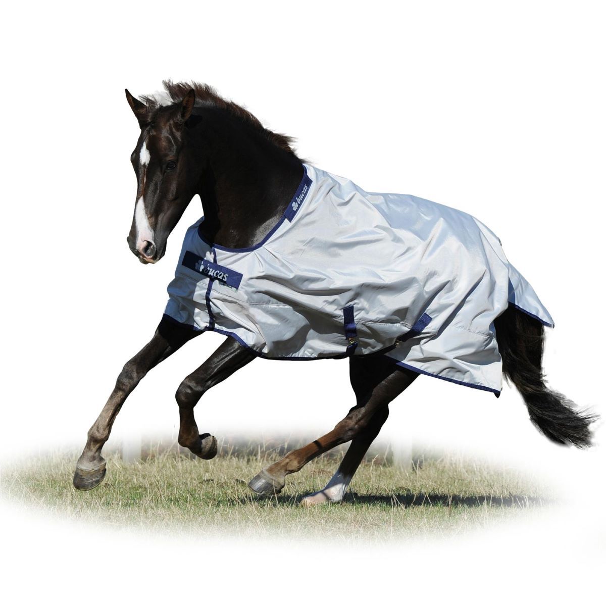 Materialul ușor impermeabil și respirabil de culoare reflectorizantă la soare (argintiu) protejează calul nu numai de pătrunderea umezelii, ci și de supraîncălzire. Căptușeala specială din plasă asigură, de asemenea, o circulație optimă a aerului.