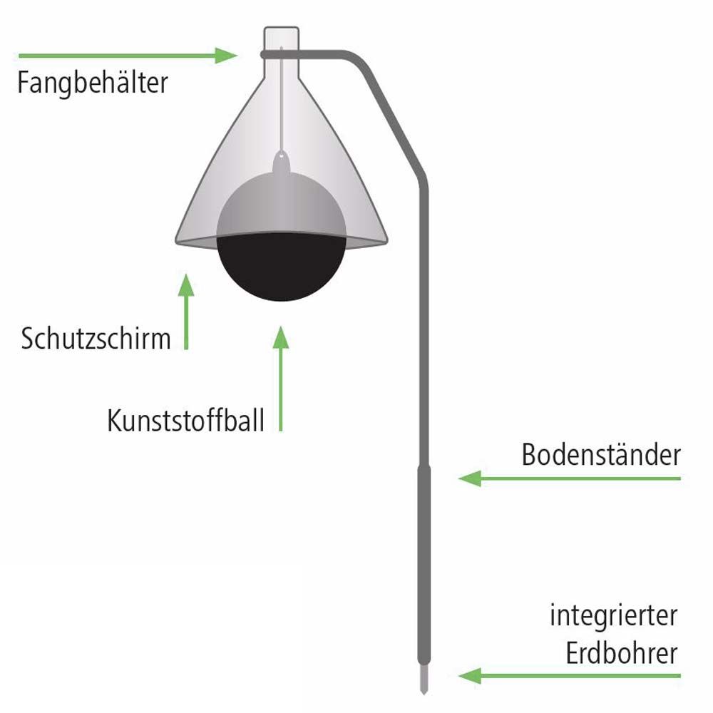 Bila mare și neagră din mijlocul capcanei este încălzită de soare și pusă în mișcare de primăvară, precum și de vânt. În acest fel, mingea de cauciuc simulează o creatură vie. De îndată ce țânțarul încearcă să muște din mingea rezistentă la înțepături, sare de pe ea. Deoarece pot zbura doar în sus, sunt dirijate prin umbrela albă a prinzătorului spre recipientul prinzătorului plin cu apă, în care se îneacă.