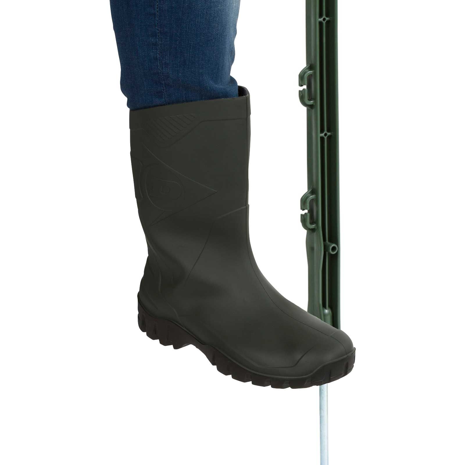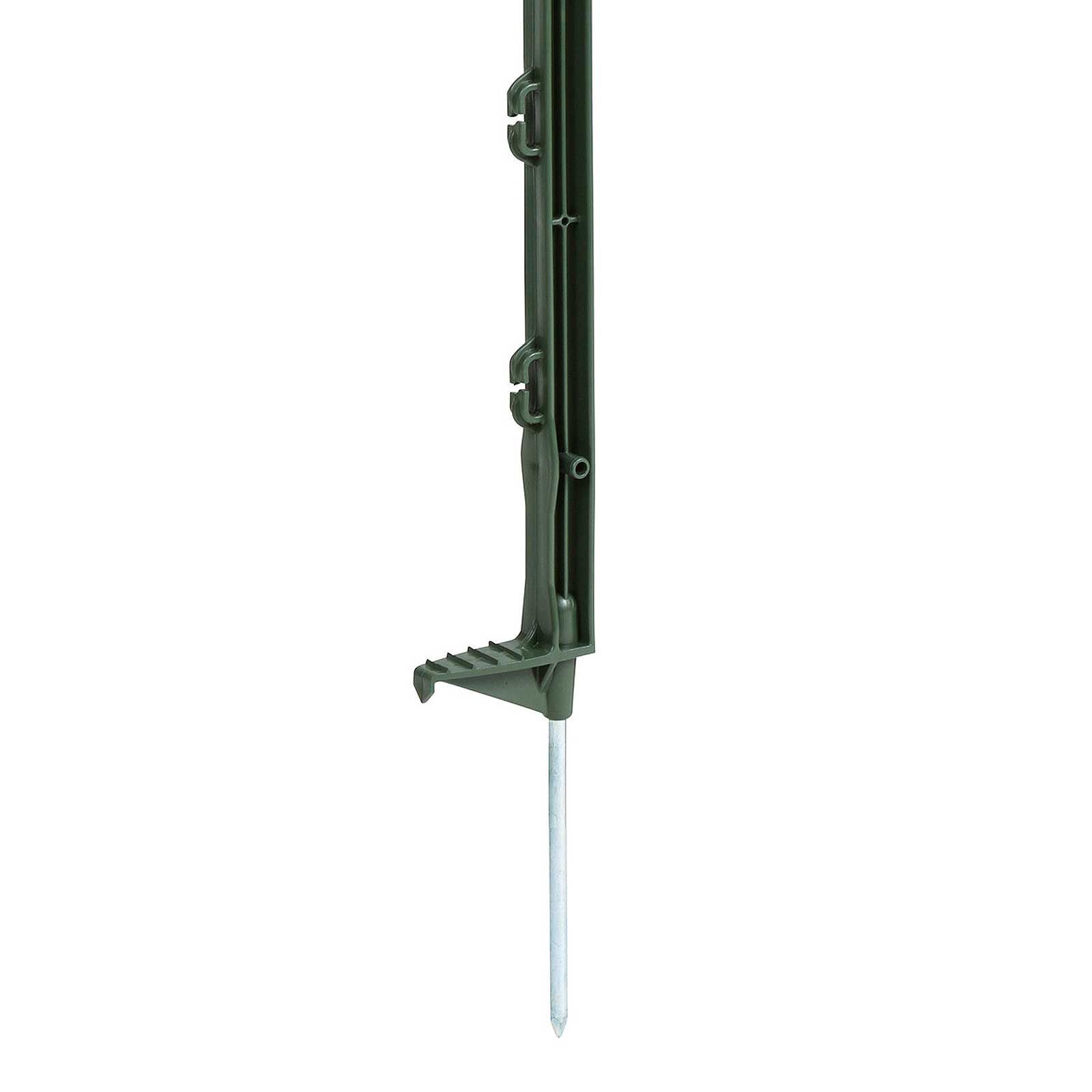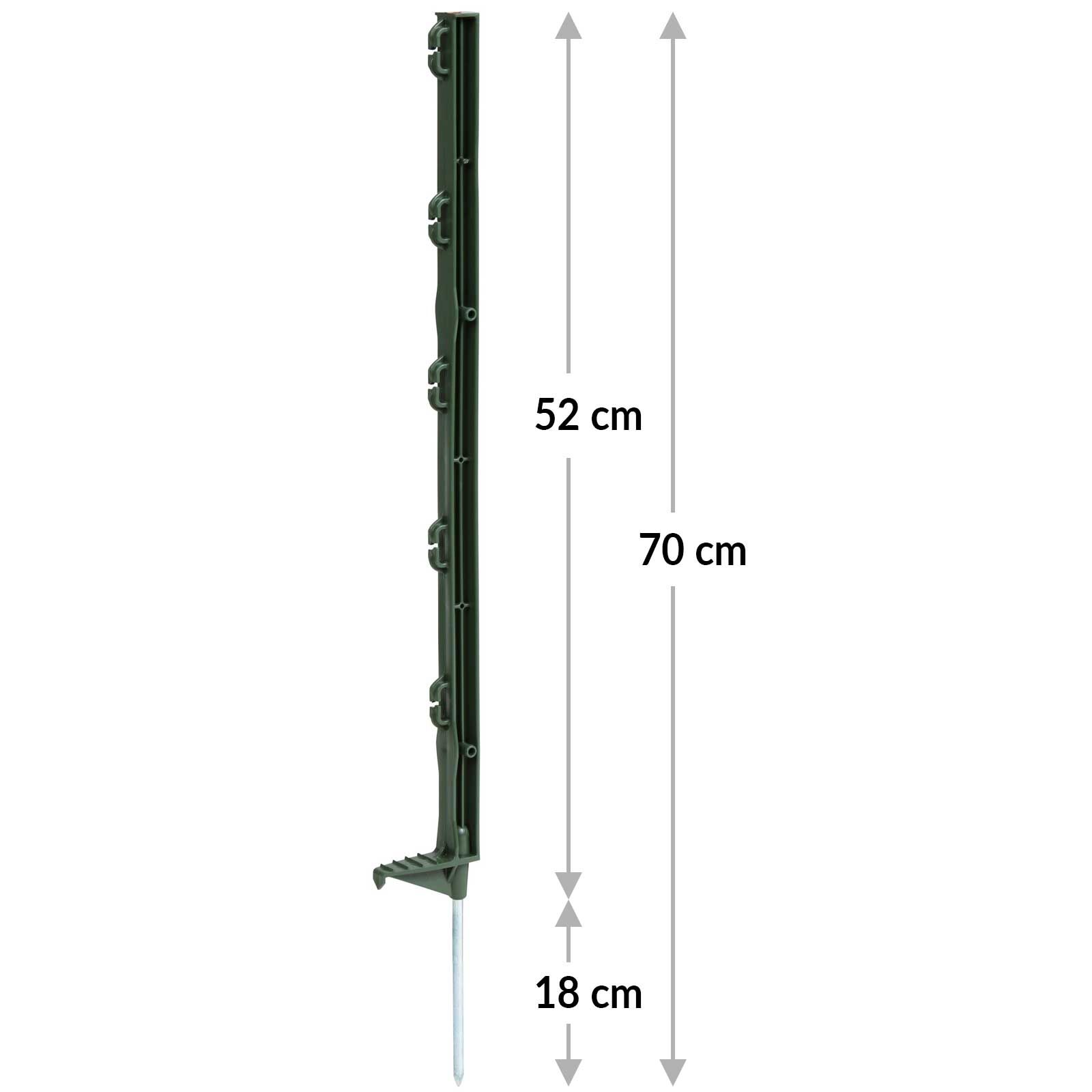 Stâlpul de gard are 5 ochiuri de bandă (2 cm) și are o lungime totală de 70 cm, din care 52 cm sunt deasupra solului. Această combinație de dimensiuni compacte și stabilitate ridicată face din stâlpul de gard pentru pășuni un produs de încredere pentru toate cerințele de apărare împotriva animalelor sălbatice și de împrejmuire a animalelor mici.