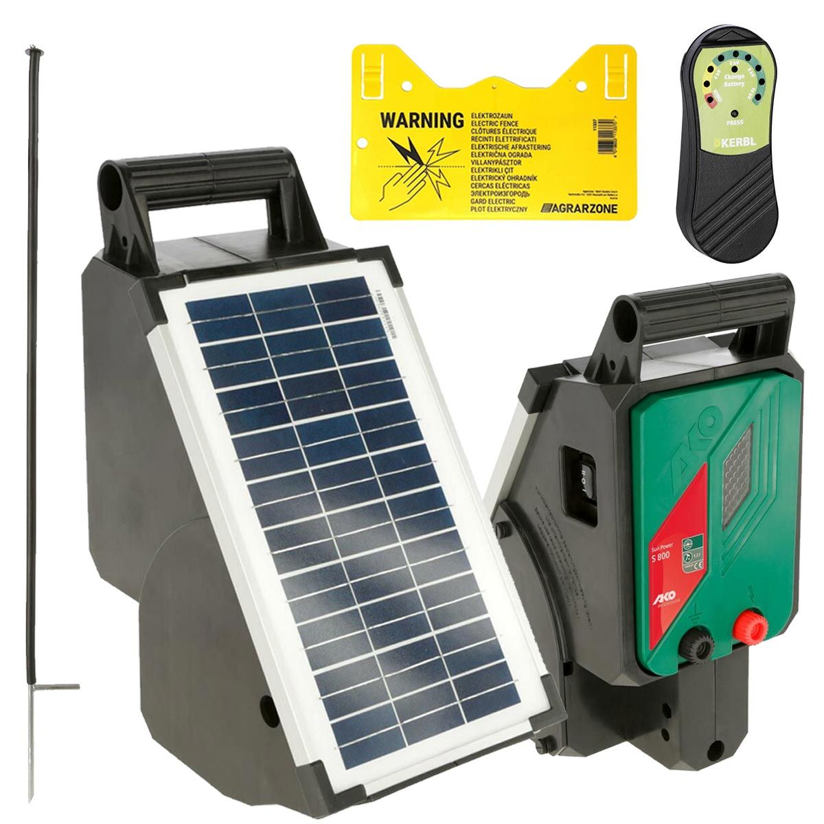 -1x Ako aparat alimentare pentru gard electric SunPower S800 12 V (incl.: 1x baterie AGM de 12 V, 1x modul solar fix de 12 V, 1x cablu de conectare pentru gard și conexiune la pământ, 1x vârf de împământare/montare în două părți)