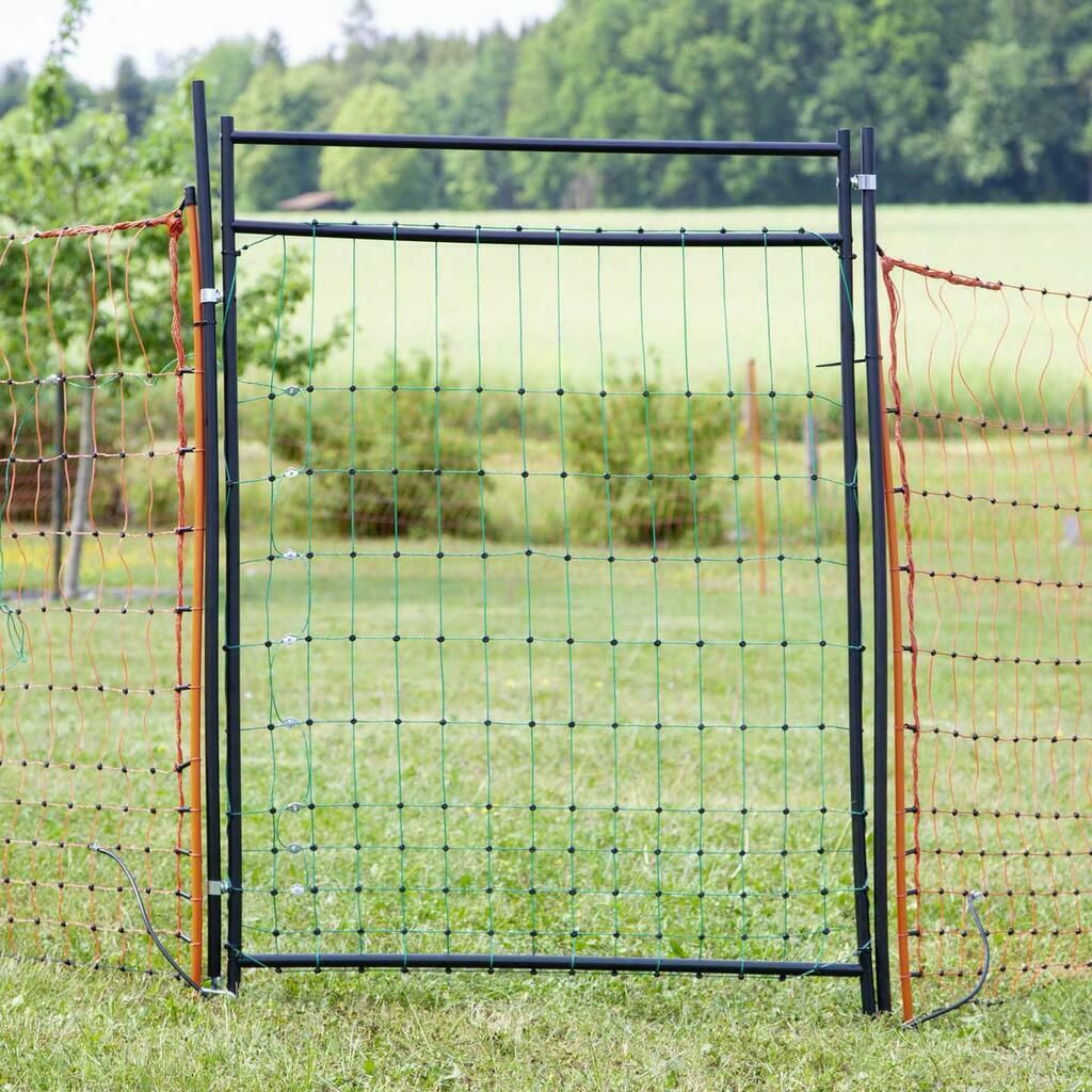 Ușa cu plasă electronică, care este de asemenea inclusă, vă oferă acces rapid și ușor la gardul pentru câini. Ușa practică este ușor de montat oriunde în plasa dumneavoastră și poate fi montată ulterior în gardul deja montat. Cadrul izolat protejează împotriva supratensiunilor și permite astfel accesul în siguranță la pășune.