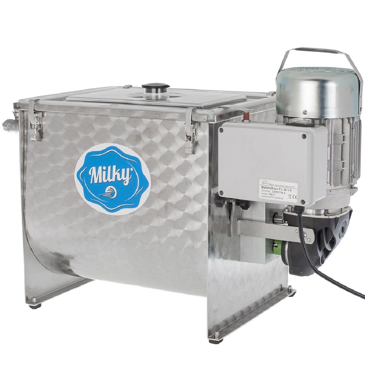 Mașina electrică de unt Milky FJ 32 / 230 V pentru uz profesional! În funcție de temperatura smântânii și de conținutul de grăsime al laptelui, Milky FJ 32 are nevoie de între 20 și 35 de minute pentru un proces. Umpleți 6 până la 13 litri de smântână în recipientul din oțel inoxidabil de 32 de litri (maxim până la axul agitatorului din oțel inoxidabil detașabil) și începeți să bateți.