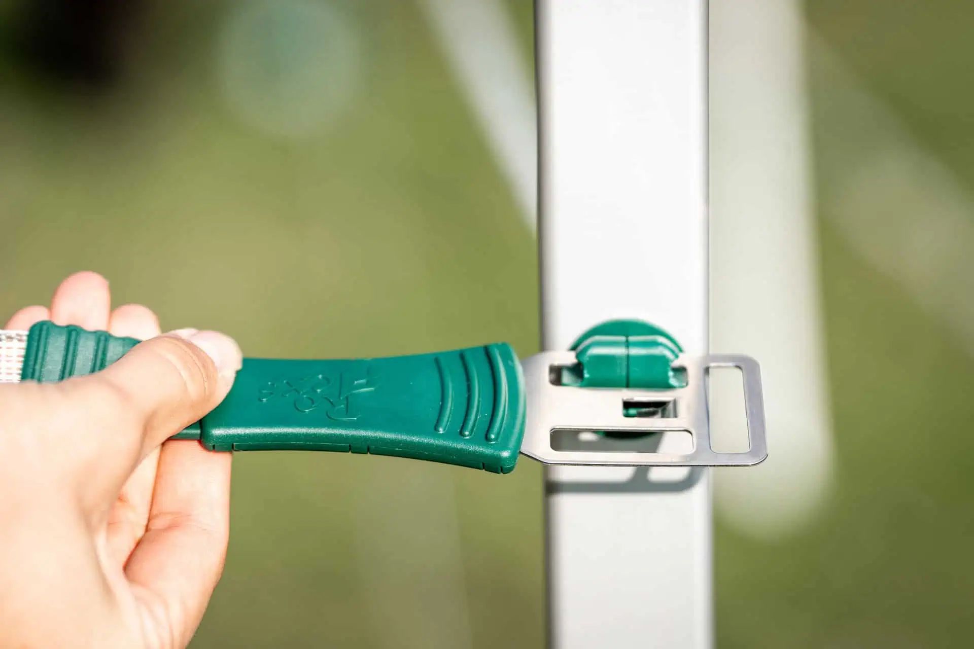 Sistemul de împrejmuire sigură Premium de la RoFlexs este echipat cu o bandă foarte vizibilă de 20 mm lățime, un sistem de autoînfășurare prietenos cu banda și o trecere internă a tensiunii capacului. Datorită sistemului de înfășurare puternic cu profil de aluminiu consolidat și rafinat (anodizat) și a unui vârf de sol stabil, din oțel galvanizat, sistemul de gard este absolut robust. Banda de gard, precum și piesele din plastic de înaltă calitate, rezistente la impact, sunt stabile la razele UV. În plus, producătorul oferă o garanție de 2 ani și o garanție suplimentară de 5 ani pentru arcurile de retragere a benzii.