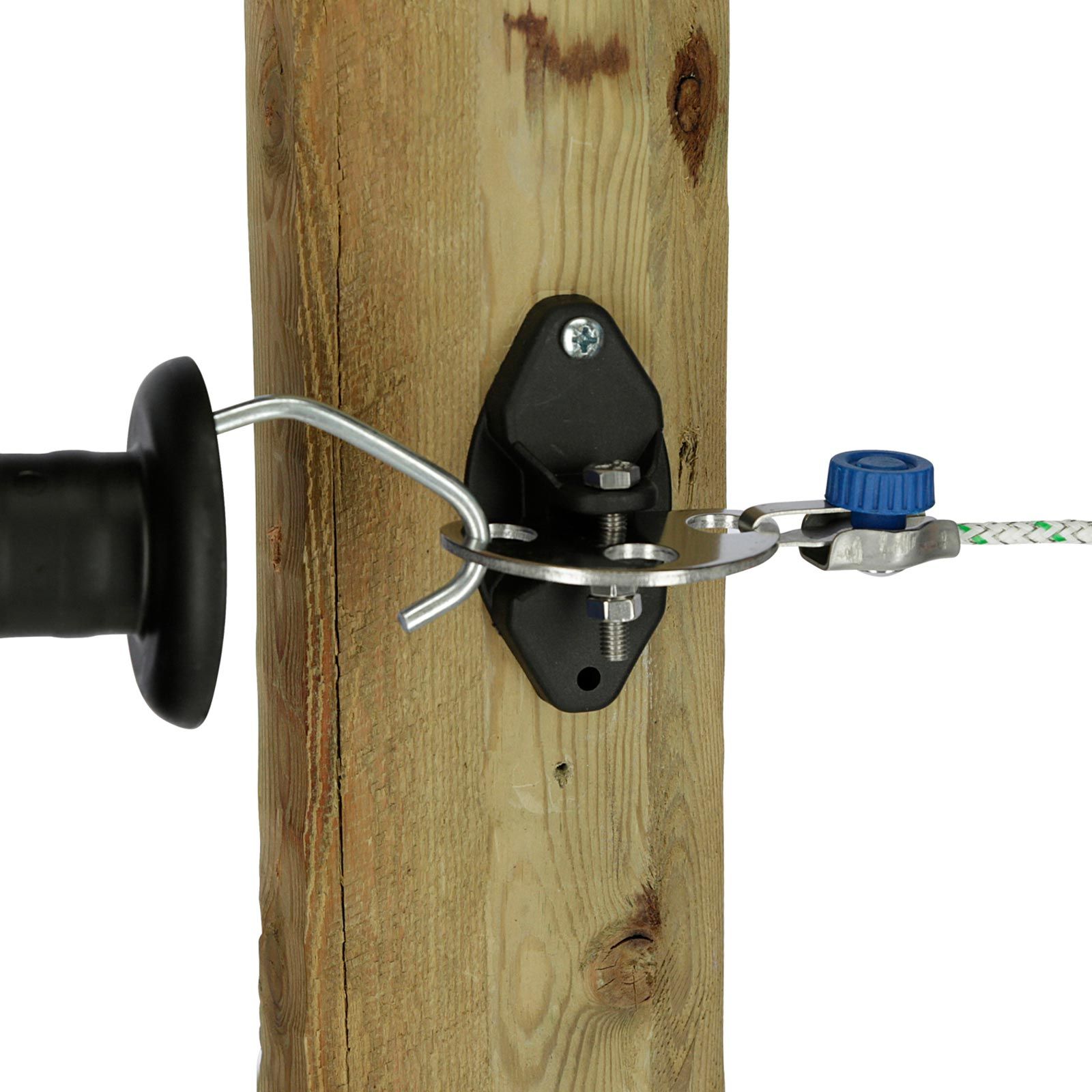 Acest conector rapid Premium de înaltă calitate, brevetat, pentru cabluri/corzi permite o conectare rapidă, simplă și optimă din punct de vedere electric a materialelor conductoare la izolatorii și mânerele porții. Conectorul este potrivit pentru toroane, frânghii de până la Ø 8 mm și benzi înguste de până la 10 mm.