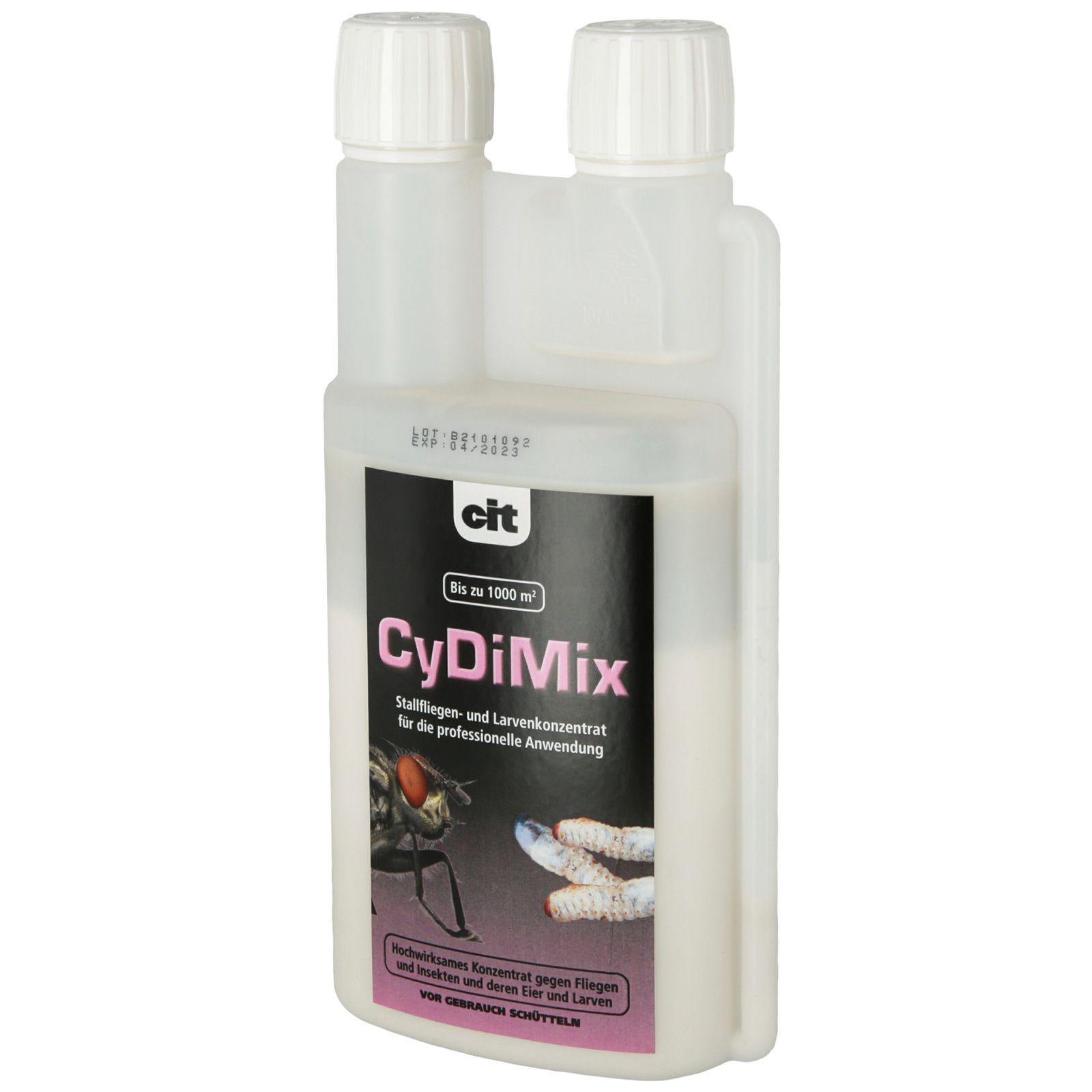 Cu concentratul stabil de muște și larve CyDiMix eliminați rapid, eficient și durabil insectele dăunătoare, precum și larvele și ouăle acestora. Ciclul de viață al dăunătorilor este întrerupt în mod eficient la contactul cu insecticidul. Datorită combinației de ingrediente active de cipermetrin (adulticid) și diflubenzuron (larvicid), efectul insecticidului este foarte rapid, de lungă durată și durabil. Pe lângă muștele adulte, căpușele, puricii și acarienii, sunt eliminați cu succes și paraziții târâtori. Agentul de control este potrivit pentru o suprafață de până la 1000 m² de grajduri, ideal pentru utilizarea în grajdurile pentru animale de fermă și de hobby, în grădinile zoologice, în transporturile de animale și în toate adăposturile pentru animale.