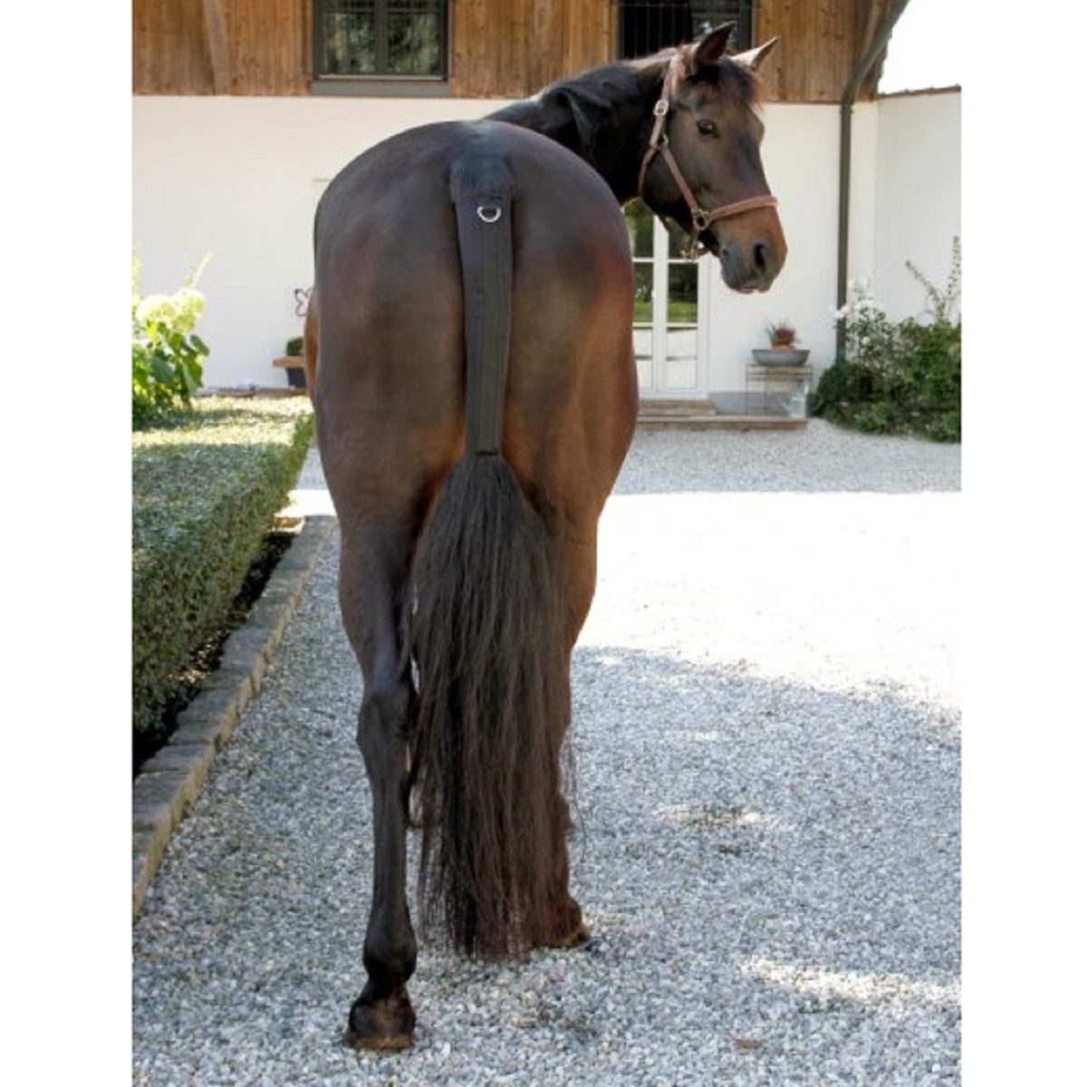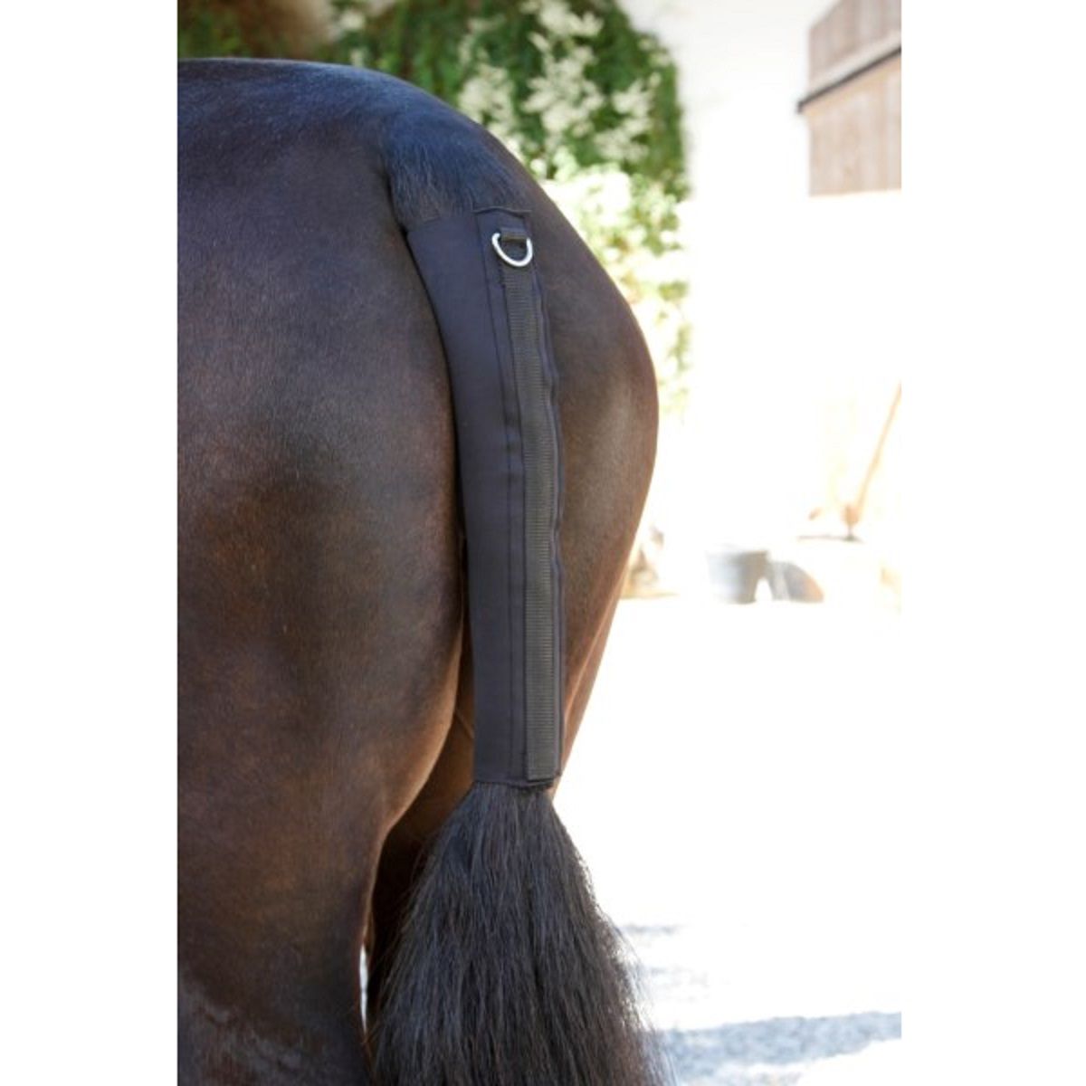 Protectorul de coadă realizat din cauciuc sintetic elastic este ideal pentru transportul cailor în remorci. Coada calului este protejată în mod ideal cu ajutorul dispozitivului de protecție a cozii. Materialul stabil, dar și moale, oferă, de asemenea, un confort plăcut de purtare pentru calul dumneavoastră. Fermoarul Velcro face ca protecția cozii pentru cai să fie ușor și simplu de atașat. Este important ca dispozitivul de protecție să nu fie prea larg, împiedicând astfel alunecarea dispozitivului de protecție a cozii. Protectorul de coadă este echipat cu un inel metalic, ceea ce îi permite să fie atașat la pătura de transport.