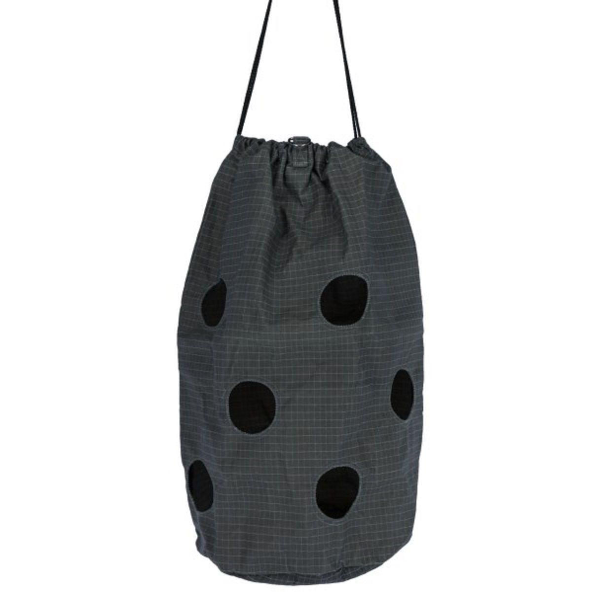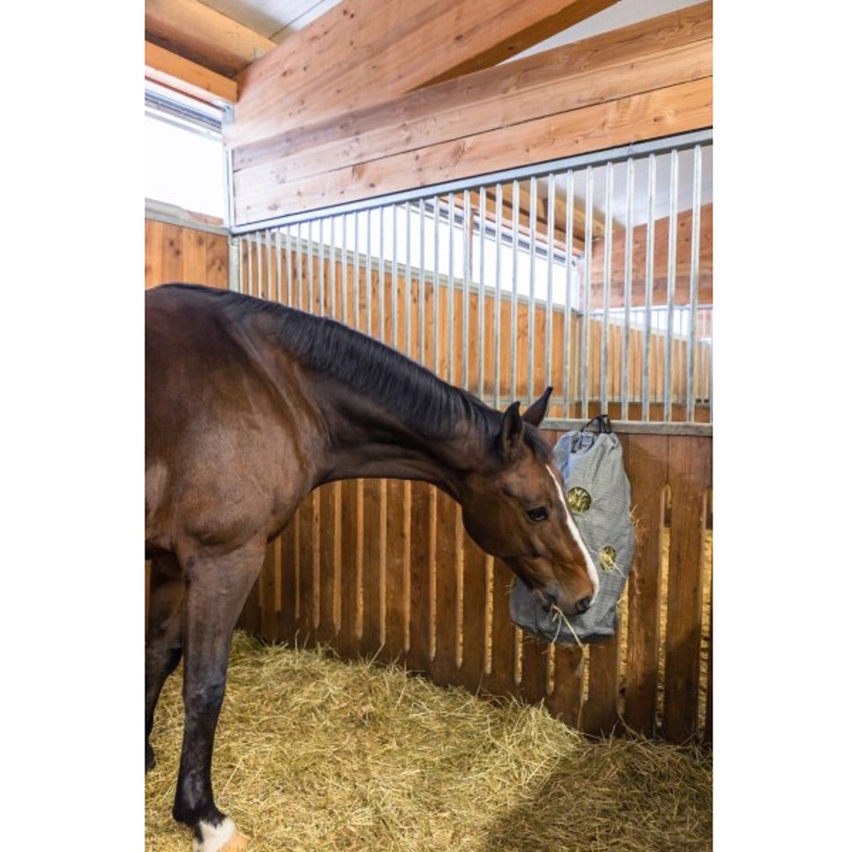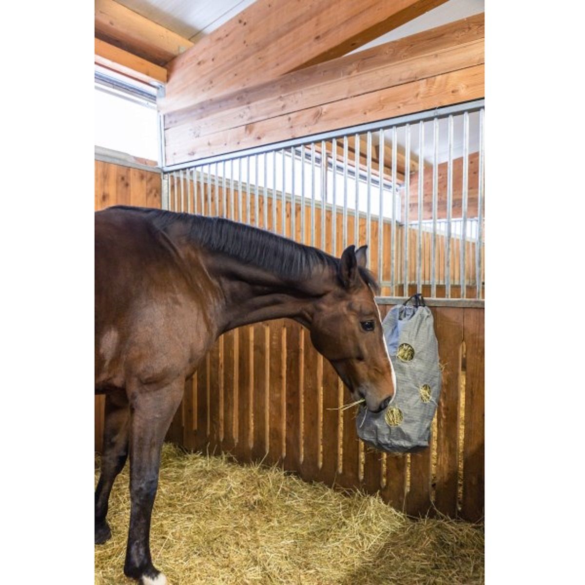 Noul sac de fân din bumbac de la Kerbl combină multe avantaje într-un singur produs. Spre deosebire de hrănirea cu fân de la sol, sacul de fân reduce pierderea de furaje cu aproximativ 15% și promovează, de asemenea, hrănirea lentă și prietenoasă cu calul. Sacul de fân HayBag este ușor de umplut fără ajutor. În plus, suprafața netedă înseamnă că există un risc mai mic de rănire decât în cazul plaselor de fân, de exemplu. HayBag poate fi folosit în multe domenii, în boxa calului, pe pășune, în remorcă și la turnee, acest sac de fân este foarte popular. Diametrul găurii este de aproximativ 8 cm la intervale de 20 cm.
