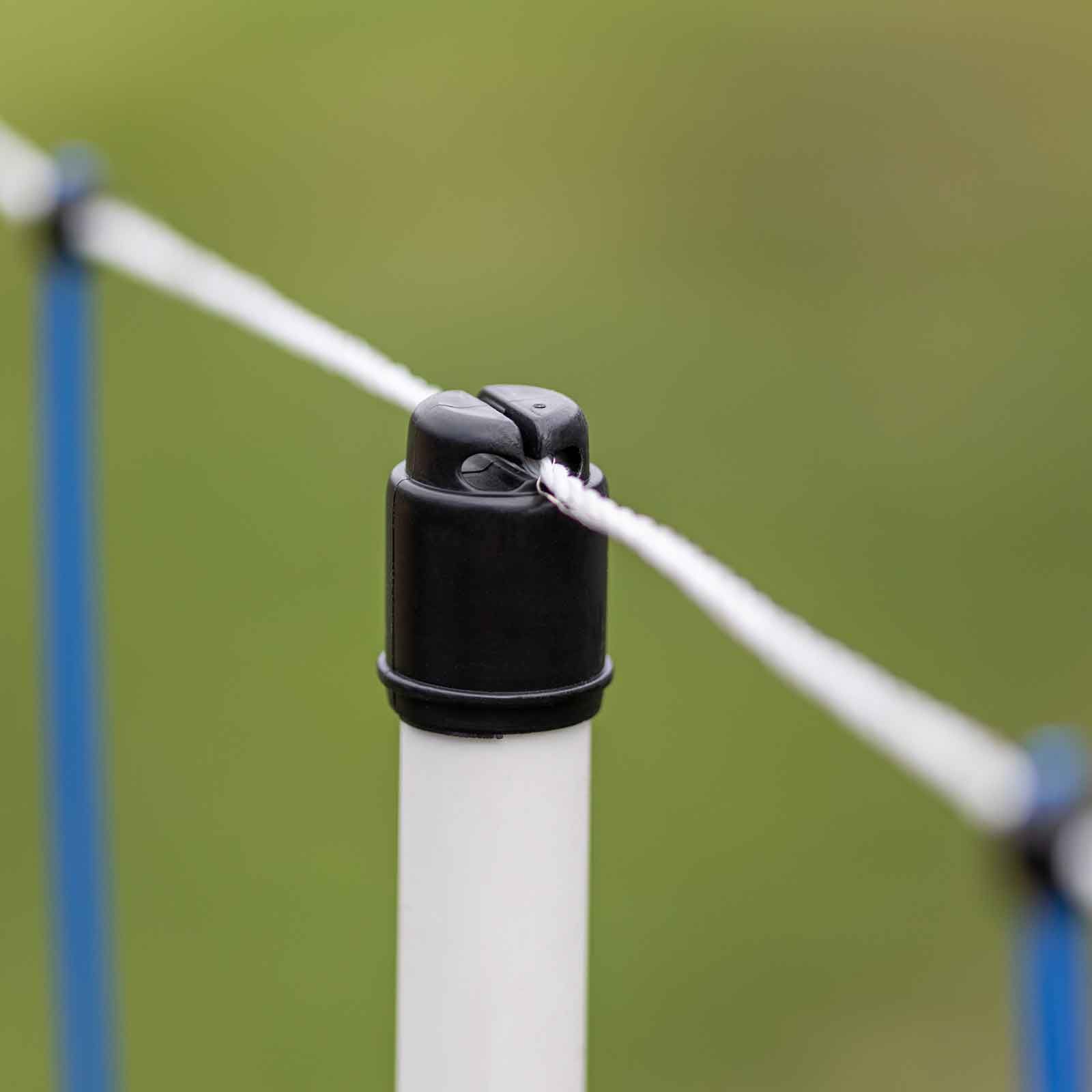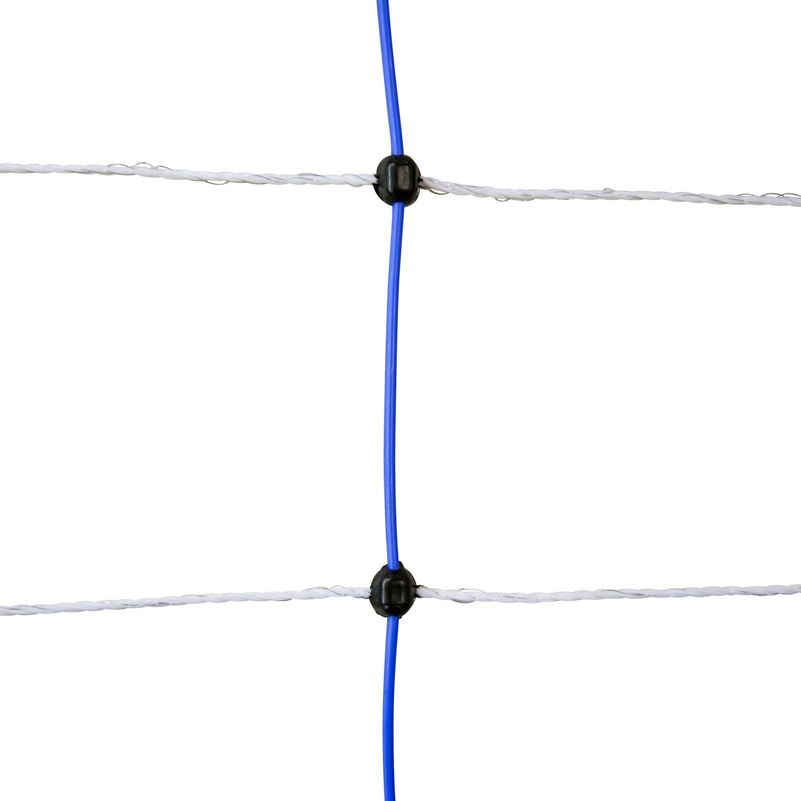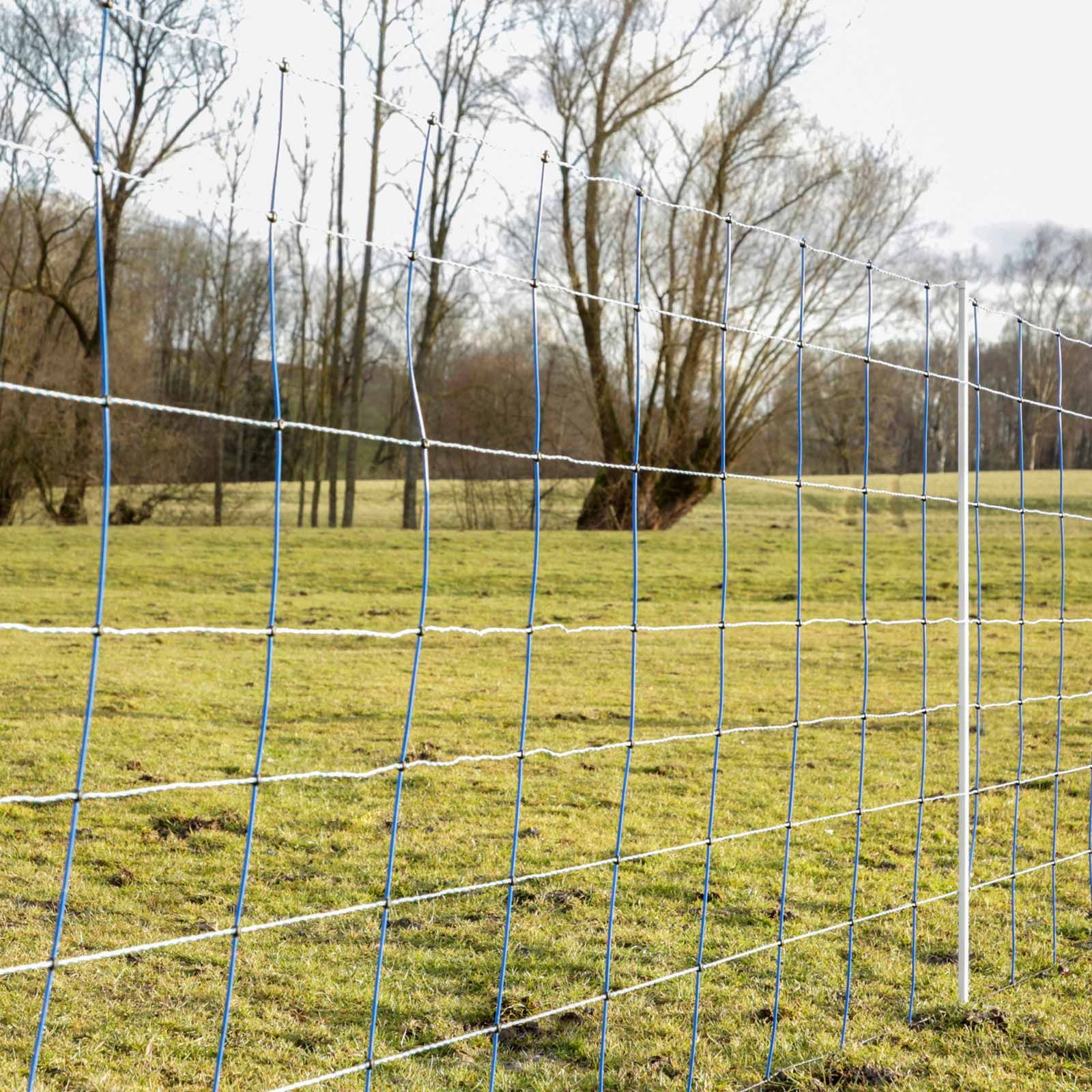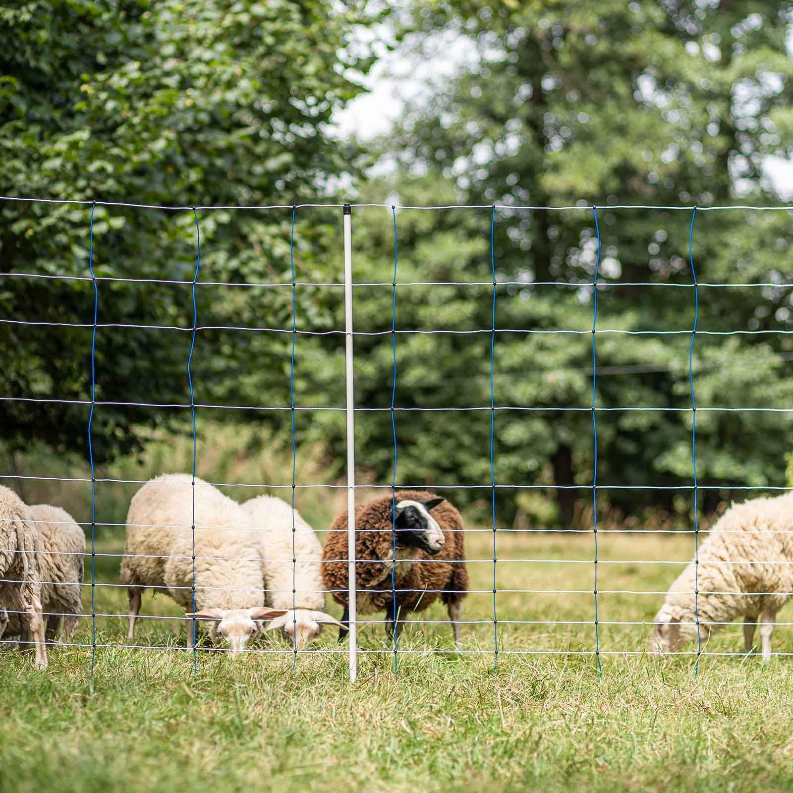 Acest model complet nou din seria TitanNet oferă cea mai bună protecție împotriva intruziunii animalelor sălbatice. Este practic imposibil să sari peste această plasă foarte înaltă. Datorită înălțimii maxime de 145 cm deasupra solului, această plasă de gard este potrivită și pentru protecția turmelor de cai, ponei, măgari, capre, oi sau alpaca. Cei 15 stâlpi din PVC foarte rezistenți, cu un diametru de 19 mm și cu vârfuri duble galvanizate, asigură un suport sigur și ferm. Suporții verticali la fiecare 30 cm, care au fost testați de ani de zile, asigură stabilitate și o adaptare optimă la teren, chiar și pe teren accidentat și accidentat. Nodurile plasei sălbatice sunt sudate foarte strâns, ceea ce previne căderea și asigură o durabilitate îndelungată. Izolatorii de cap și opritorii de masă integrați fac aproape imposibilă slăbirea independentă a cablului. Firul superior întărit, care transportă curentul, crește conductivitatea prin utilizarea a 5 conductori din oțel inoxidabil și a unui conductor din cupru stins. În condiții dificile de sol, se poate conecta opțional un fir de împământare întărit pentru legarea la pământ pe întreaga lungime a plasei, așa cum este cazul, de exemplu, în cazul solurilor foarte nisipoase sau pământoase.