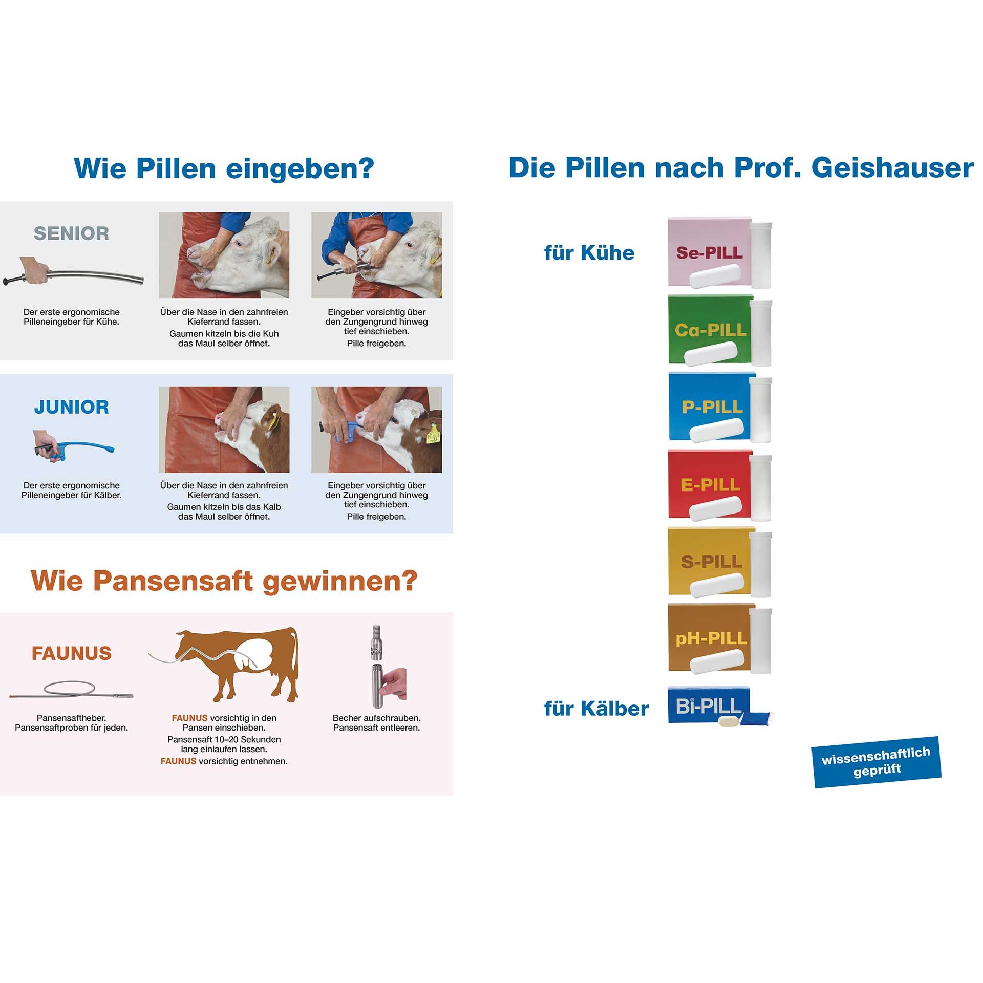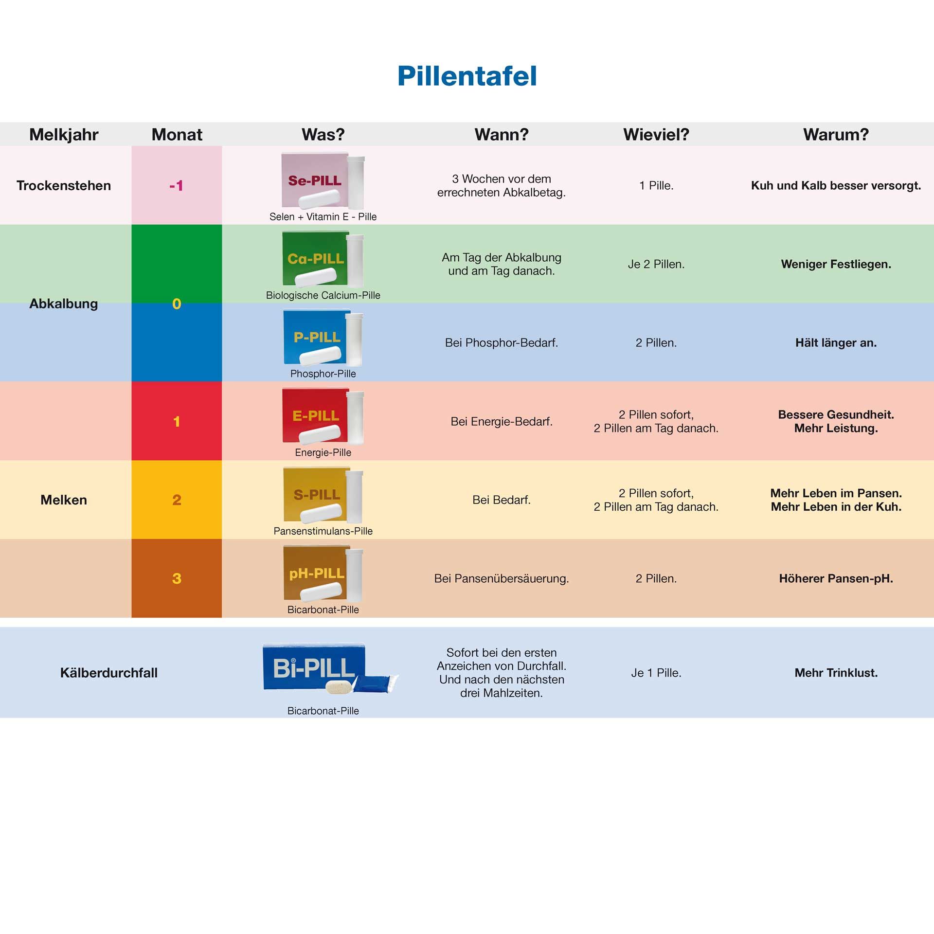 Aplicare: se administrează 1 pastilă imediat și 1 pastilă după fiecare dintre următoarele 3 mese. Pentru vacile care alăptează, se administrează 4 pastile deodată. În mod ideal, păstrați Bi-PILL în stoc pentru a putea reacționa rapid.